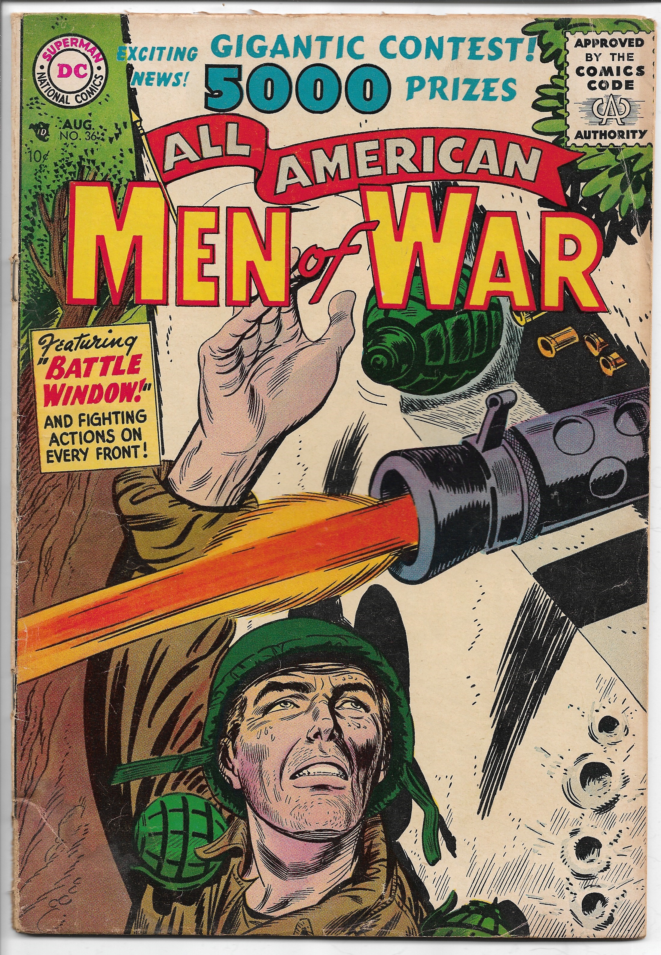 All American Men of War #36, Aug. 1956. Condition Very Good Minus. (Selling this one for only $29.95).Please note: Binding coming a little loose on bottom, little stain on left bottom of back cover, otherwise a very nice comic book.