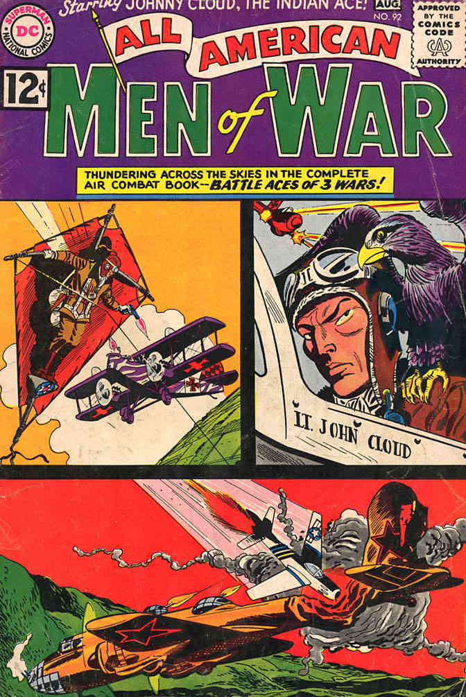 Item: All-American Men of War #92 | Publisher: DC | Cover Date: August 1962 | Writer: Robert Kanigher, Bob Haney, Morris Waldinger | Artist: Irv Novick, Jack Abel, Morris Waldinger, Ross Andru | Cover Artist: Jerry Grandenetti | Appearances: Lt. Johnny Cloud | Storylines: The Battle Hawk!; Ace on a String!; Abundance of Strength…; Double Ace in Double Trouble! | With Economy shipping, each additional comic ships for just 50 cents more to customers in the USA. This listing contains a stock photo and information from ComicBase™ and © Human Computing. The stock photo is for reference only. If you would like to see a photo of the actual item, please message us prior to purchasing.Seller Information