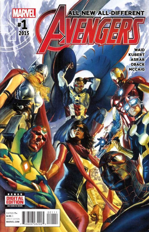 Written by Mark Waid. Art by Adam Kubert and Mahmud A. Asrar. Cover by Alex Ross. The Avengers are dead--long live the Avengers! Earth's Mightiest Heroes--Captain America, Thor, Vision, and Iron Man--are living separate lives, not tied to any team--but when a threat from beyond the stars targets our world, fate draws them together once more, alongside Nova, Ms. Marvel, and Miles Morales a.k.a. Spider-Man! Actual item pictured. Ships bagged and boarded in sturdy box and 100% Satisfaction Guaranteed. Ships same or next day! Minor spine stress.Seller Information