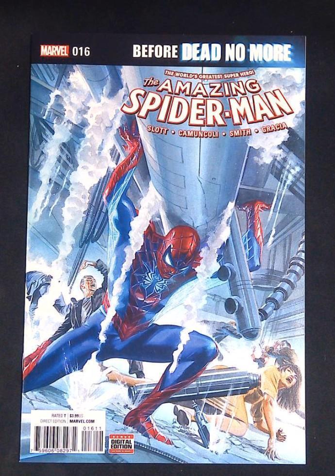 The Amazing Spider-Man #16 features Spider-Man facing a new crisis as he battles to prevent a disaster, setting the stage for the "Dead No More" storyline. This issue showcases intense action and dynamic artwork, with Spider-Man's heroism at the forefront. The cover art is crafted by the talented Camuncoli.