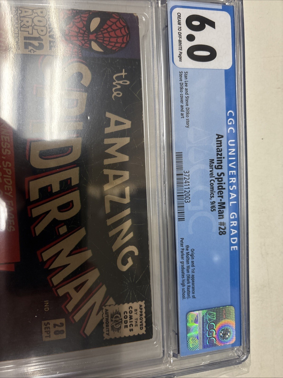 Grade: 6.0 FineSwing into the world of vintage comics with Amazing Spider-Man (1965) #28, featuring the first appearance of Molten Man. This issue is a notable collectible for fans and historians of U.S. comics alike, showcasing the web-slinging hero in a classic struggle against one of his most intriguing adversaries.Marvel enthusiasts and collectors will appreciate that this piece comes professionally graded by the Certified Guaranty Company (CGC) with a 6.0 Fine grade, ensuring its quality and authenticity. The comic's certification number, 3724112003, guarantees its place in the pantheon of comic book memorabilia. Add a touch of superhero lore to your collection with this iconic Spider-Man narrative.