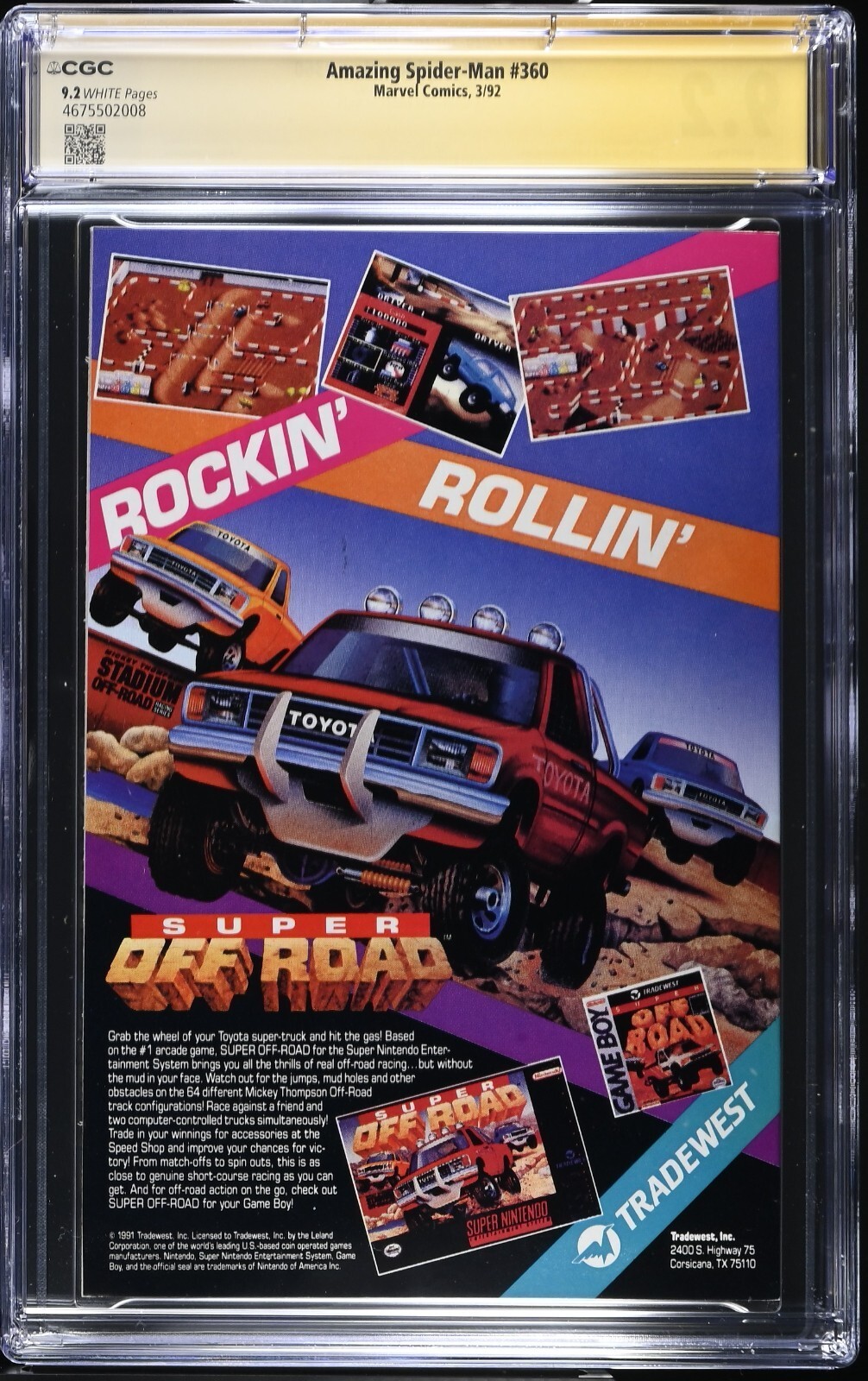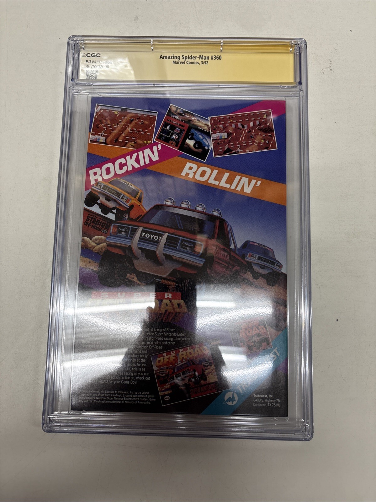Grade: 9.2 Near Mint-Swing into the world of Marvel with the Amazing Spider-Man (1992) #360, a must-have for any Spidey fan or comic collector. Featuring the web-slinging hero in all his action-packed glory, this issue comes certified by the CGC with an impressive grade of 9.2 Near Mint-, ensuring its top-notch preservation and quality.Adding to its collectibility, this particular copy is personally signed by the artist Mark Bagley, contributing to its uniqueness and value. Published in 1992 during the Modern Age of comics, it's a piece of superhero genre history emanating from the United States, complete with the iconic Spider-Man character and the assurance of Marvel's renowned storytelling.