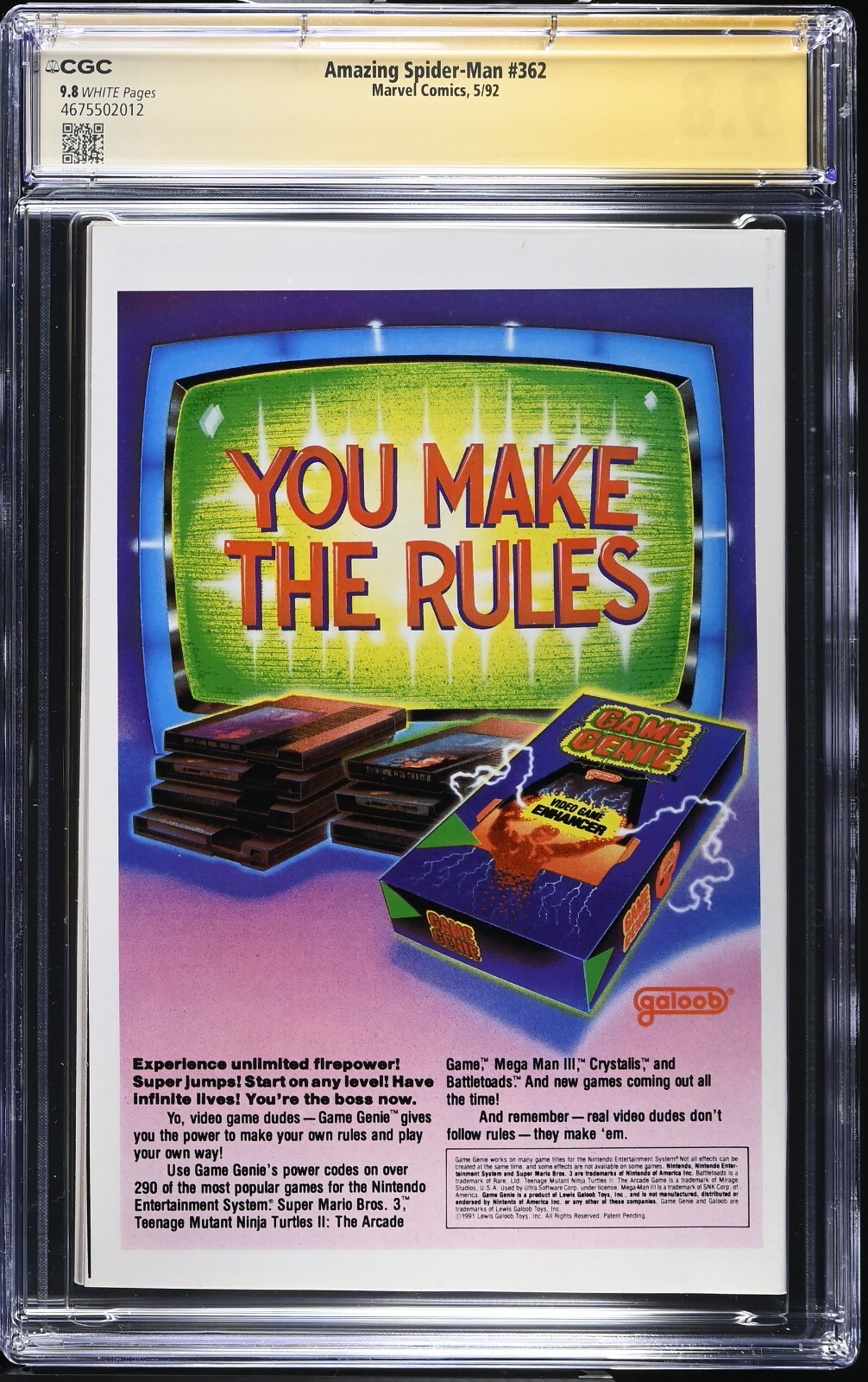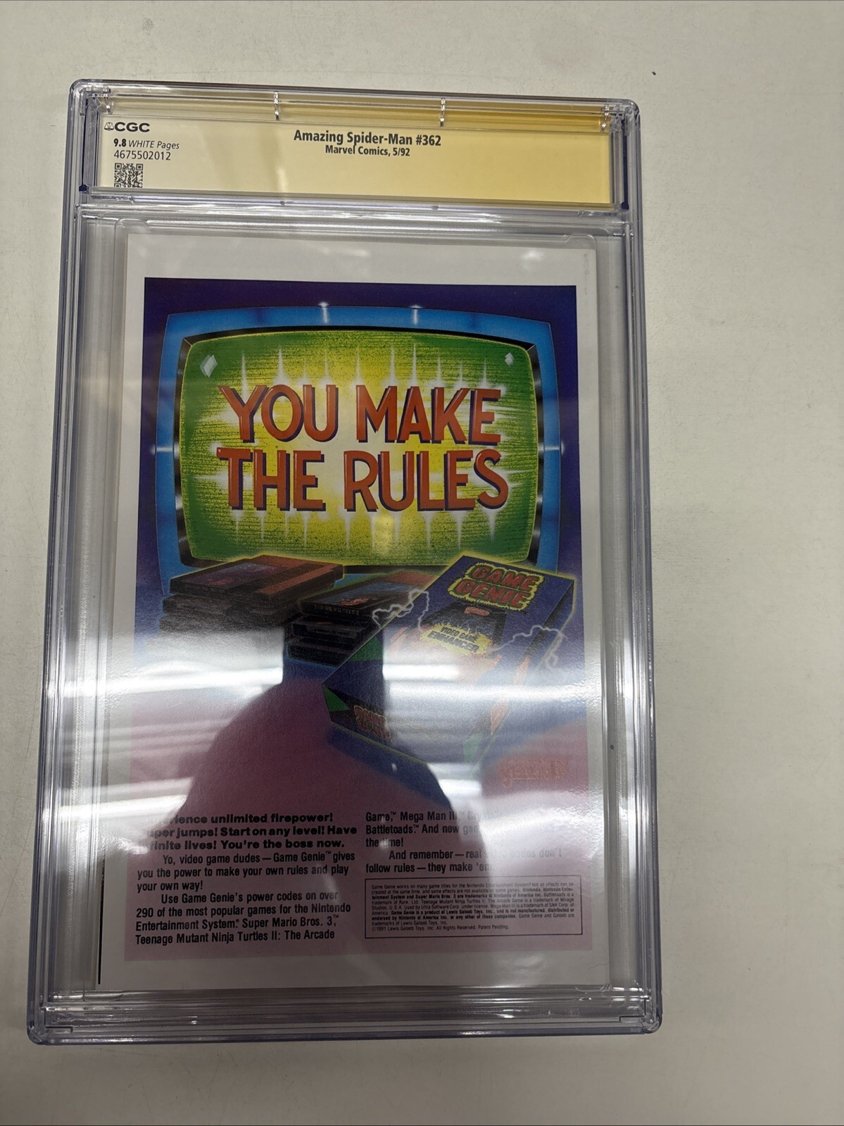 Grade: 9.8 Near Mint/MintSwing into the world of Marvel with the Amazing Spider-Man (1992) #362, a must-have for any Spidey fan or comic collector. This issue, graded at a pristine 9.8 Near Mint/Mint by the CGC, showcases the iconic web-slinger in the Modern Age of comics. But that's not all—this particular copy is signed by the artist Mark Bagley, adding a personal touch to an already valuable piece.Published in 1992, during the era of big superheroes, this comic book comes from a rich tradition of US comics and is a testament to the enduring popularity of the Amazing Spider-Man series. Whether you're looking to complete your collection or just appreciate the artistry of a classic superhero genre, this comic is a fine acquisition that celebrates the legacy of one of Marvel's most beloved characters.
