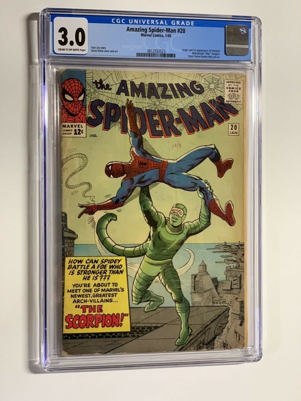 Amazing Spider-man 20 CGC 3.0 cr/ow pages marvel 1965 1st scorpion. Here at Cloud 9 Comics and More, the original since 2004, we strive for 5 stars positive feedback for every transaction. If we have not met this s ... Read More