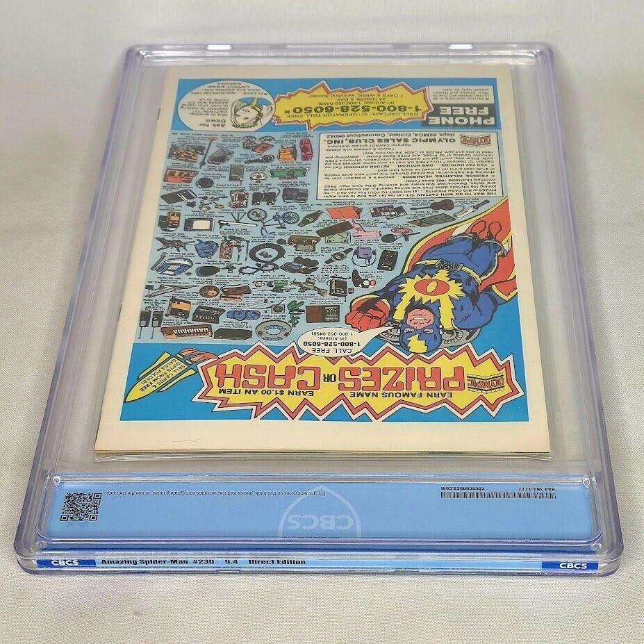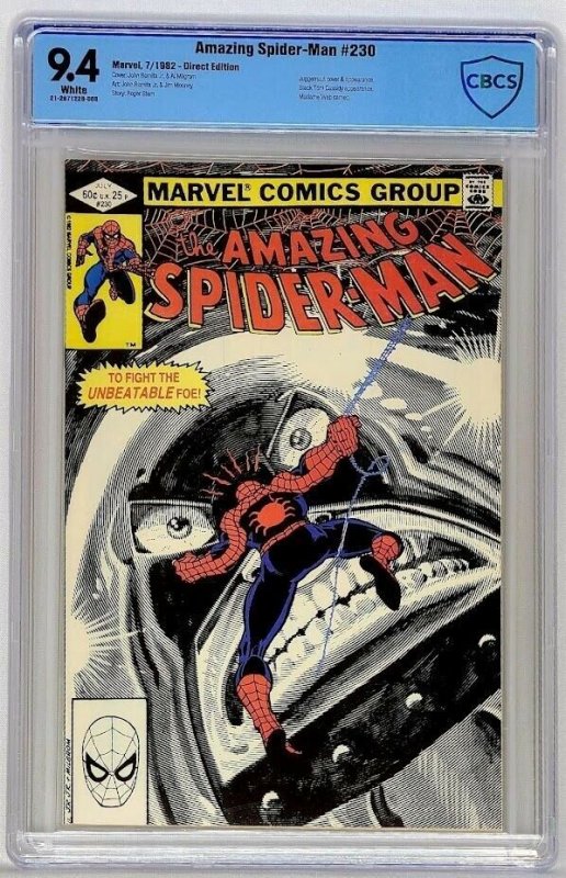 Amazing Spider-Man #230 Marvel 1982 CBCS 9.4 Juggernaut Madame Webb KeyCBCS Grading Notes:21-287122B-008Amazing Spider-Man #230 Marvel 7 1982Variant: Direct Edition9.4 Certified WhiteNotes: light crease top left back cover does not break colorTo Fight the Unbeatable Foe!" Part 2 of 2. Script by Roger Stern. Art by John Romita Jr. (breakdowns) and Jim Mooney (finishes). Cover by John Romita Jr. and Al Milgrom. The Spectacular Spider-Man and the Juggernaut battle from cover to cover across New York City! The web-slinger is furious after the Juggernaut ripped Madame Web out of her life support chair last issue! And with his clairvoyant friend now lying in a coma, the fighting mad wall-crawler vows to do whatever it takes to defeat his invincible foe! Spider-Man throws steel girders, wrecking balls, gasoline trucks, and the proverbial kitchen sink at the Juggernaut! But nothing works! Is there any way to stop the indestructible brute? Your friendly neighborhood Spider-Man will find it or die trying! (Notes: The Juggernaut returns in Uncanny X-Men 183. He clashes with the wall-crawler again in Marvel Team-Up 150. Madame Web appears next in Amazing Spider-Man 239.) Cover price $0.60. Grade: CBCS 9.4Certified grade of 9.4 NM Near Mint by CBCS and encapsulated. White pages. Grading notes availing in description. Comes as shown, see the exact items you will receive in photos. Slab: No notable issues.