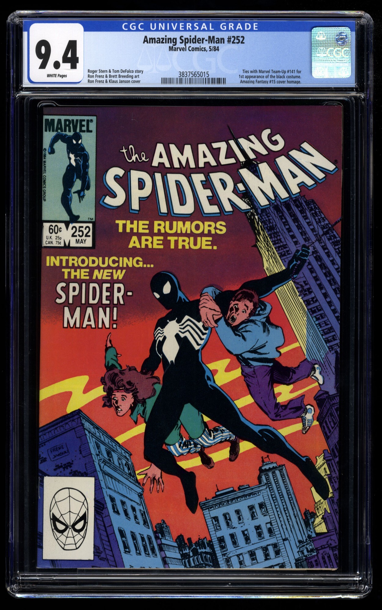 Amazing Spider-Man #252 CGC NM 9.4 White Pages 1st Black Costume!