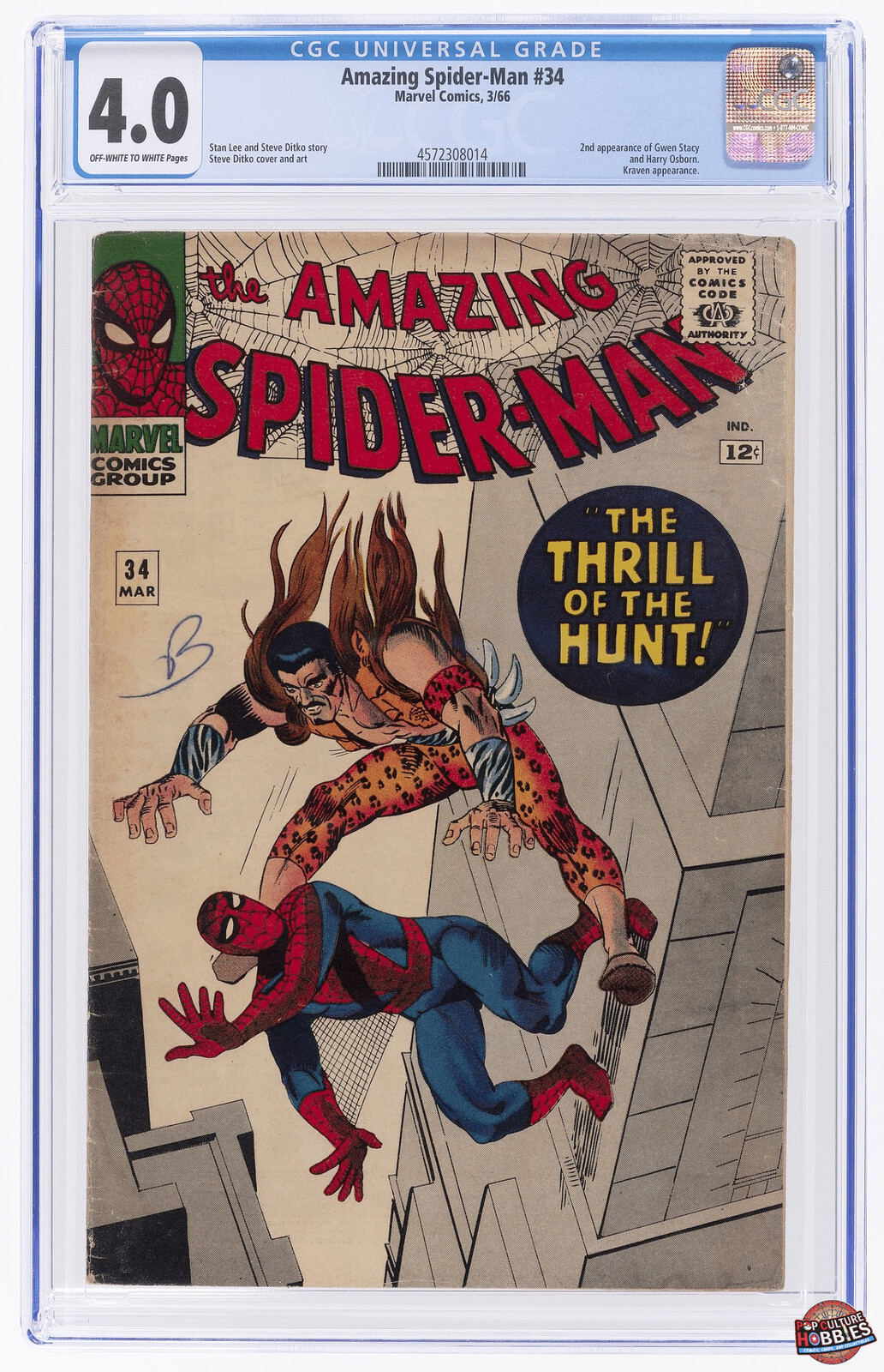Amazing Spider-Man #34 (Mar 1966, Marvel) CGC 4.0 Amazing Spider-Man #34 (Mar 1966, Marvel) CGC 4.0 CGC-graded copy of Amazing Spider-Man #34, published by Marvel Comics in March 1966, graded 4.0 (VG) with off-white to white pages. A notable mid-1960s issue in the Spider-Man run, this comic features: 2nd appearance of Gwen Stacy and Harry Osborn Kraven the Hunter appearance Story by Stan Lee, art and cover by Steve Ditko Classic Ditko layout with bold cover action and sharp colors This book is encapsulated by CGC and carries the serial number 4572308014. A solid investment-grade copy of a key Silver Age Spider-Man issue. Shipping Fast U.S. shipping. All books are carefully packed to ensure safe delivery. Collectibles are shipped via your selected method and fully insured. Pop Culture Hobbies LLC may substitute carriers when necessary. Orders over $500 may require signature confirmation. Please note: Hip’s Best Offer option does not allow buyers to request an invoice for combined shipping. If you wish to purchase multiple items with combined shipping, please use the “Add to Cart” feature instead of Best Offer. Offers Pop Culture Hobbies uses a range of pricing tools, including GPAnalysis, Overstreet, TCGPlayer, the CGC Census, and recent Hip sales, to price items deliberately and competitively. While we encourage buyers to do their own research, we generally stand by our pricing. That said, we do entertain reasonable offers when possible and Best Offer is enabled on most listings. Please understand that we cannot always accept every offer, and we do not respond to messages asking for our “lowest price.” Unreasonable offers are typically ignored. We Buy and Consign We buy thousands of comics, toys, non-sport trading cards and other Pop Culture Collectibles every month from collections large and small. We also accept consignments and will list your comics and collectibles on Hip for you. Check out our website for our contact info. Service Additional Images: We own every comic we list, and the product images show the actual item you’ll receive. To keep our website performance optimized, we typically post only the front cover. However, we're happy to provide additional photos upon request. We aim to respond within hours, and always within 24 hours. Product Returns: You may return any item within 30 days if you're not satisfied. If the item was inaccurately described, incorrect, or missing components, we'll cover return shipping. For all other reasons, the buyer is responsible for return shipping. Items must be returned in the same condition as received.
