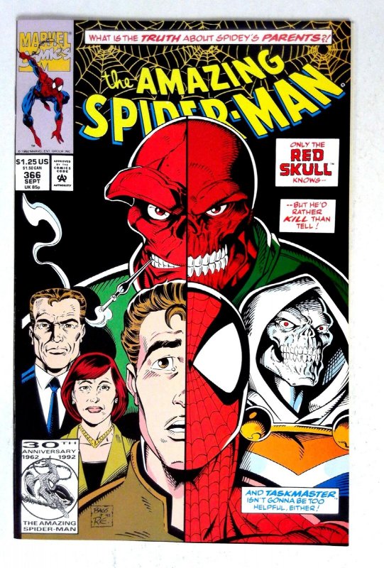 Amazing Spider-Man #366 (1992) Red Skull Taskmaster Marvel VF/NM Amazing Spider-Man The cover features the Red Skull and Taskmaster alongside Peter Parker. Storyline explores the mystery around Spidey's parents. TIT ... Read More