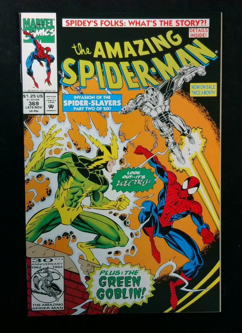 In "The Amazing Spider-Man #369," Spidey faces the electrifying threat of Electro, while navigating the treacherous plot involving the Spider-Slayers. This is part two of the six-part "Invasion of the Spider-Slayers" storyline. The issue also features the Green Goblin, adding to the high stakes and action-packed narrative.