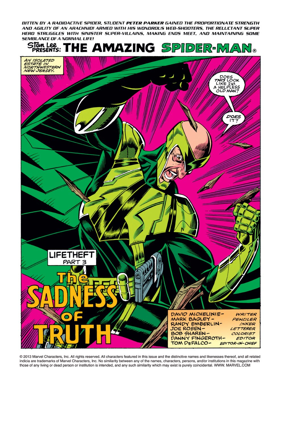 Shock follows shock as Peter Parker learns the painful truth about his parents! Inside the Chameleon's New Jersey hideaway, the faceless villain reveals that Richard and Mary Parker are artificial simulacrums (aka life model decoys). The web-slinger is stunned. But there's no time for sorrow as the wall-crawler must stop his "parents" from revealing his secret identity! Once the Chameleon morphs Richard into a killing machine the battle lines are drawn: the Vulture, the Chameleon, and the Richard LMD vs. the Amazing Spider-Man! As the fight progresses, could a mother's love -- even the love from an artificial mom -- propel her web-spinning son to victory? A heartbreaking ending for all. Final appearances of the Richard Parker and Mary Parker life model decoys.