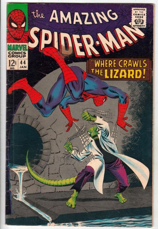Amazing Spider-Man #44 - The Amazing Spider-Man ARTIST - John Romita Snr. APPEARANCE - 2nd Lizard aka Dr. Connors This book would be in Very Fine or better condition if not for a circle stain on the back cover. Th ... Read More