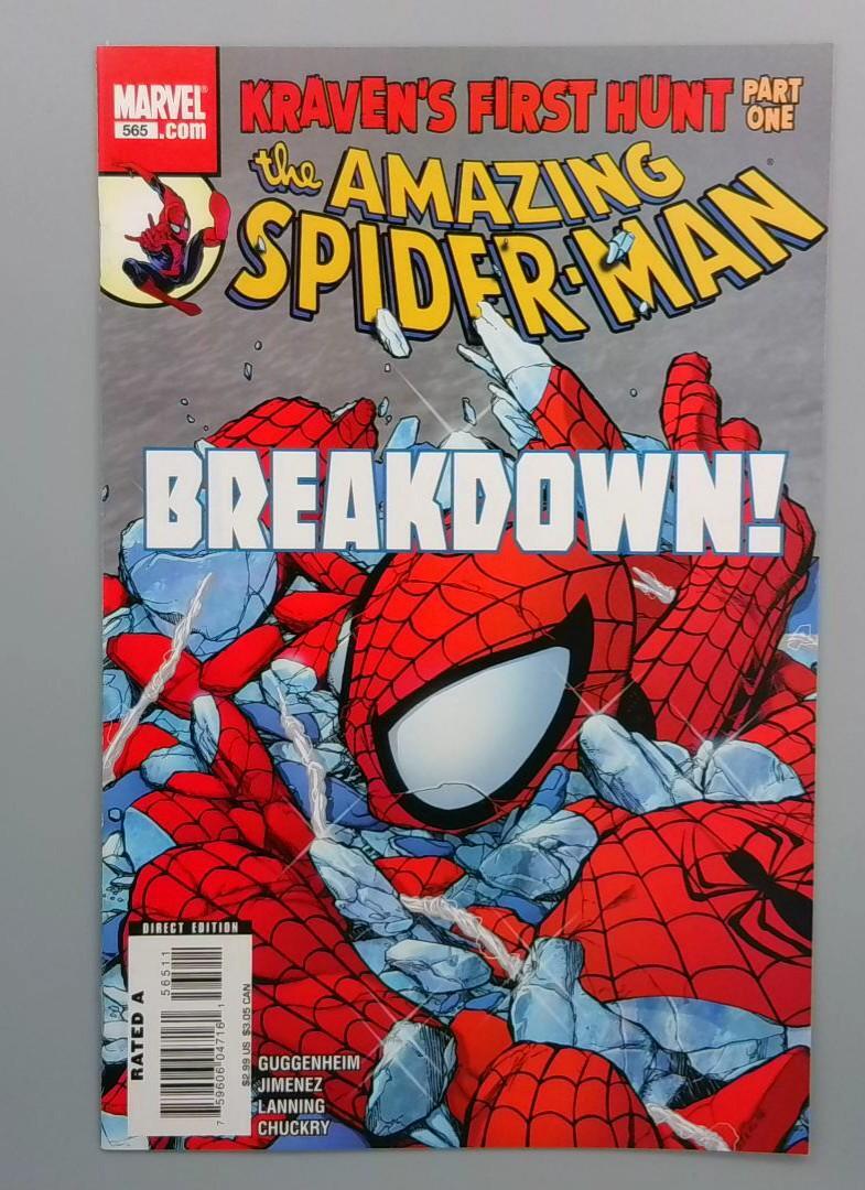 The Amazing Spider-Man #565 features the beginning of "Kraven's First Hunt" storyline, showcasing a dramatic encounter between Spider-Man and the legendary hunter Kraven. The cover dramatically depicts Spider-Man in a state of breakdown or intense struggle, with a fractured, blue-tinted background emphasizing the high-stakes conflict. This issue is written by Marc Guggenheim and illustrated by Salvador Jimenez, promising an intense exploration of Spider-Man's challenges and Kraven's hunting prowess.