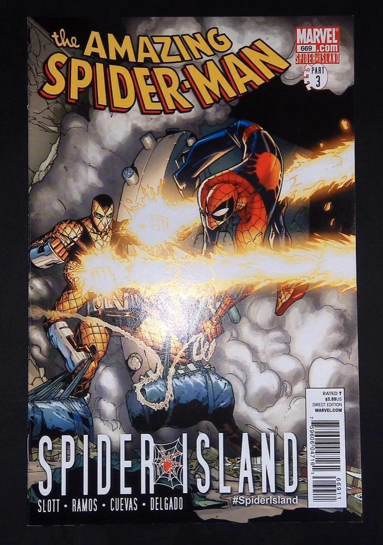 In "The Amazing Spider-Man" #669, part of the "Spider Island" storyline, New York is overrun with spider-powered individuals, creating chaos across the city. Spider-Man faces new challenges as he tries to combat villains who have gained similar powers. Featuring artwork by Humberto Ramos, the issue continues the thrilling and complex narrative from Dan Slott, exploring themes of identity and heroism amid a city-wide crisis.