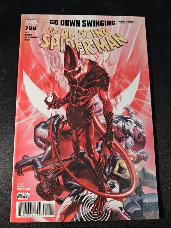 In "The Amazing Spider-Man #799: Go Down Swinging Part Three," Spider-Man faces the formidable threat of the Red Goblin, a terrifying fusion of Norman Osborn and the Carnage symbiote. As the city teeters on the brink of chaos, Peter Parker must confront his most dangerous adversary yet. This issue is pivotal in the climactic storyline, showcasing intense action and high stakes for Spider-Man and his allies. The cover art, featuring the Red Goblin dominating the scene, adds to the issue's dramatic tension.