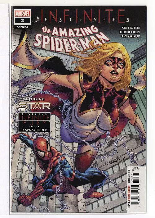 Grade: 9.2 Near Mint-Amazing spider-man annual (2018 marvel) #2 cvr a sergio davila item number: cxwh-r16354 spider-man vs. Star! The next can't-miss installment of the 'infinite destinies' saga is here! Spider-man thinks he knows reality warpers - but he's never met ripley ryan. Mass murderer and occasional thunderbolt, star is still searching for her own path�and the power to shape her future however she wants. But can the wielder of the reality stone really go up against a hero who's fought gods?! Find out here - and get the next piece of the infinity stone puzzle! Also in this issue: part 4 (of 8) of 'infinite fury'! Rated t+
