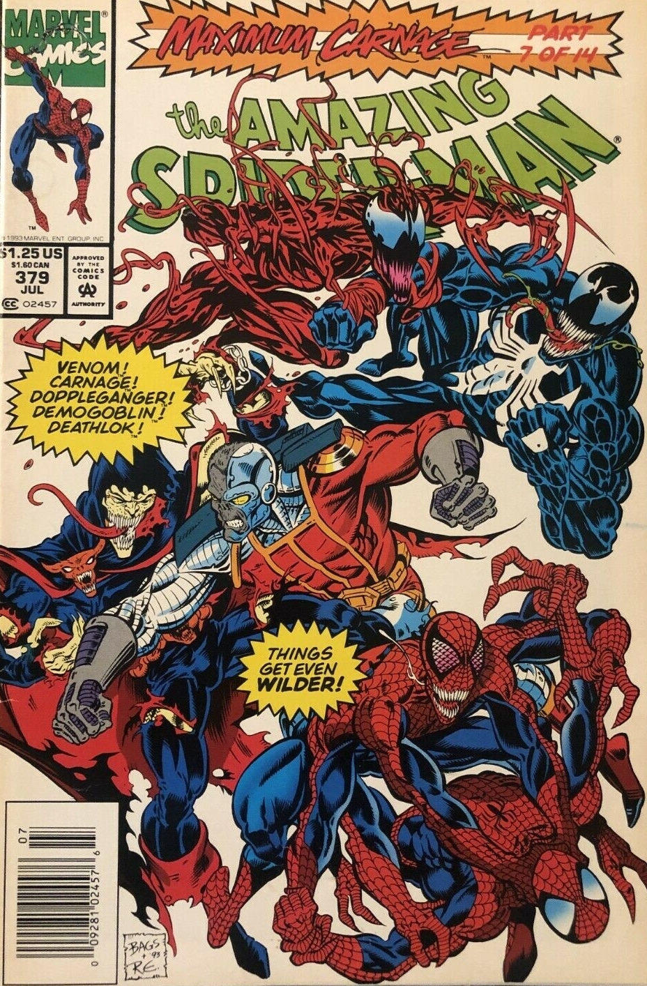 Item: Amazing Spider-Man, The #379 (Newsstand) | Publisher: Marvel | Cover Date: July 1993 | Writer: David Michelinie | Artist: Mark Bagley | Cover Artist: Mark Bagley | Appearances: Carnage, Venom | Storylines: Max ... Read More