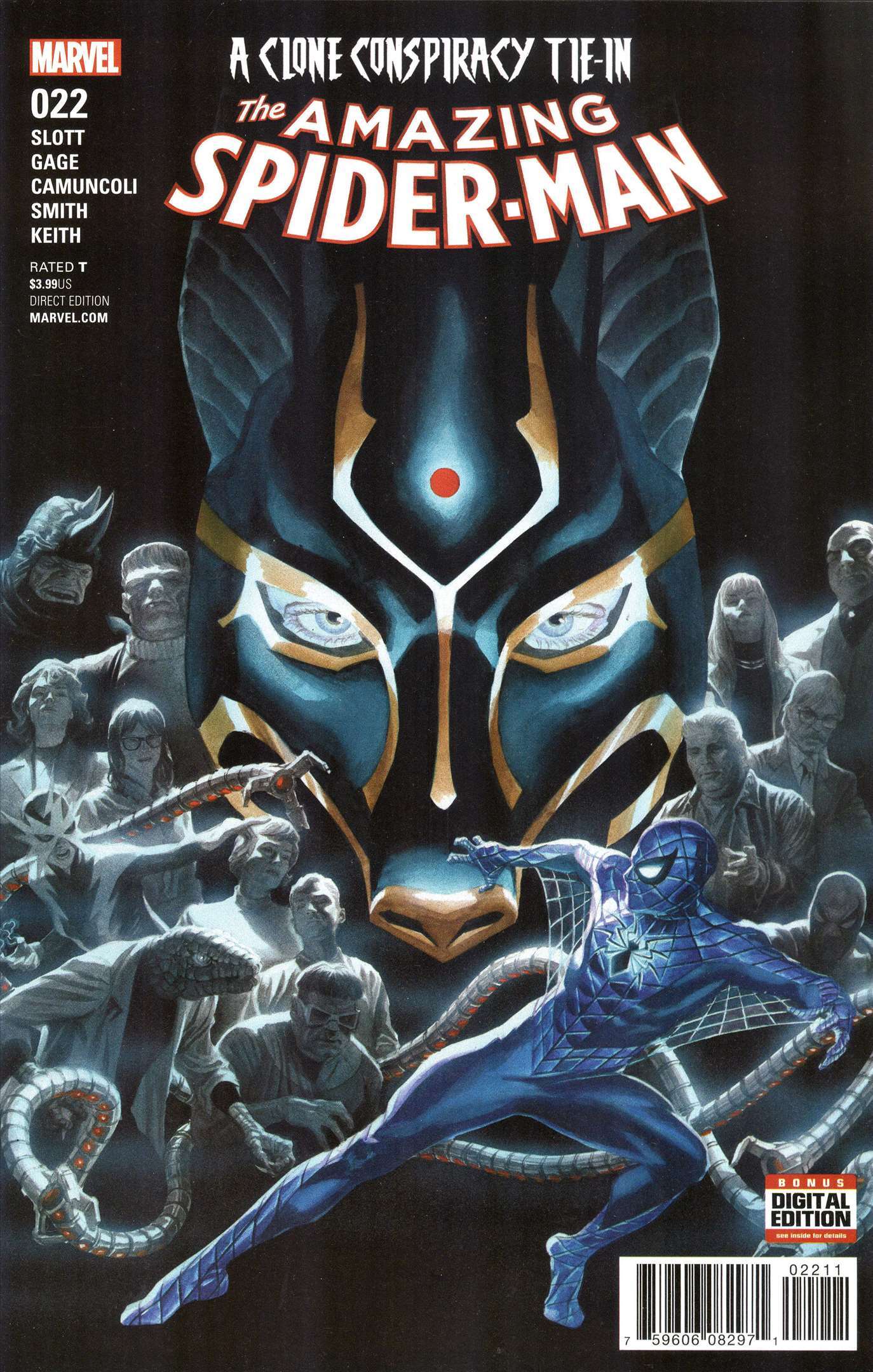 Item: Amazing Spider-Man, The (4th Series) #22 | Publisher: Marvel | Cover Date: February 2017 | Writer: Dan Slott | Artist: Giuseppe Camuncoli | Cover Artist: Alex Ross | Appearances: Daily Bugle, Betty Brant, J. Jonah Jameson, Ned Leeds, Mysterio, New U Technologies, Jackal (Ben Reilly), Miles Warren (clone), Harry Osborn, Ben Parker, May Parker, Robbie Robertson, Spider-Man, Gwen Stacy, Flash Thompson, Mary Jane Watson, Desiree Winthrop | Storylines: Seeing Red | Notes: A Clone Conspiracy Tie-in | With Economy shipping, each additional comic ships for just 50 cents more to customers in the USA. This listing contains a stock photo and information from ComicBase™ and © Human Computing. The stock photo is for reference only. If you would like to see a photo of the actual item, please message us prior to purchasing.Seller Information