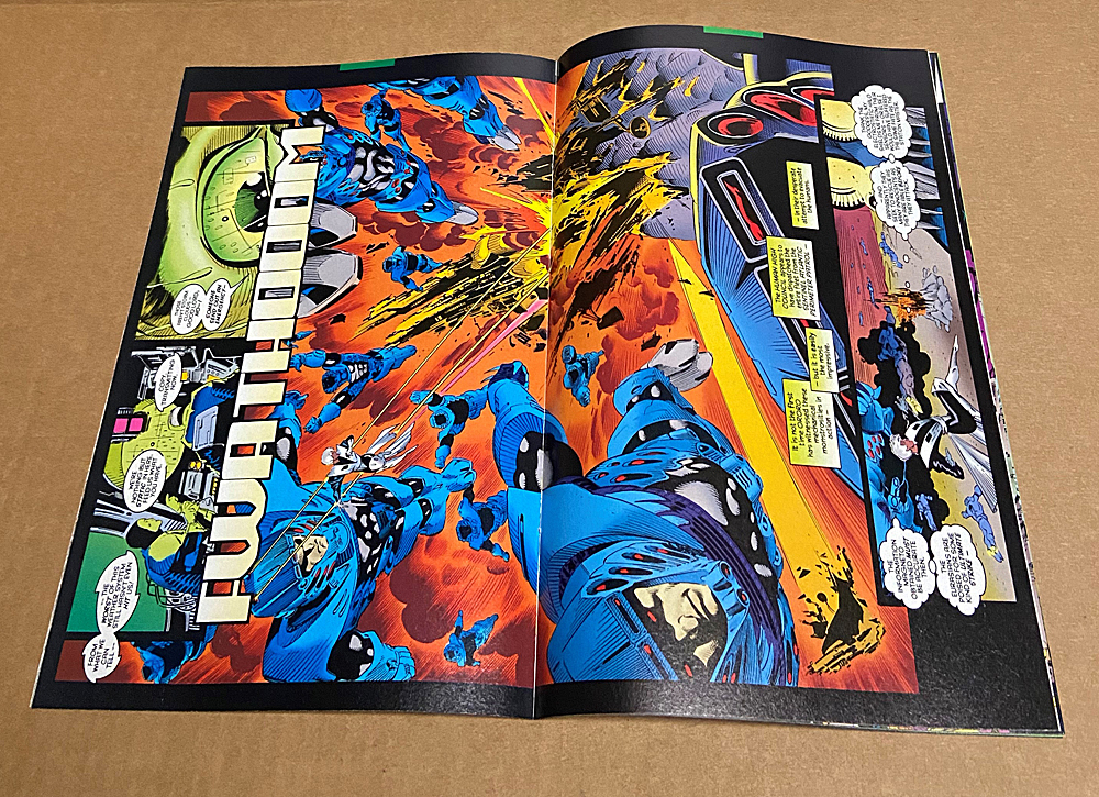 This is the first printing (has a trading card ad on the back cover). Cover art by Andy Kubert. The Crossing Guards, script by Fabian Nicieza, pencils by Andy Kubert, inks by Matt Ryan; Bishop has found the X-Men and tells them of a world where Xavier did not die and Apocalypse does not rule; Magneto sends the X-Men to help human exiles flee the wrath of Apocalypse; they run up against agents of Apocalypse who have been sent to stop them. Text piece on Age of Apocalypse.