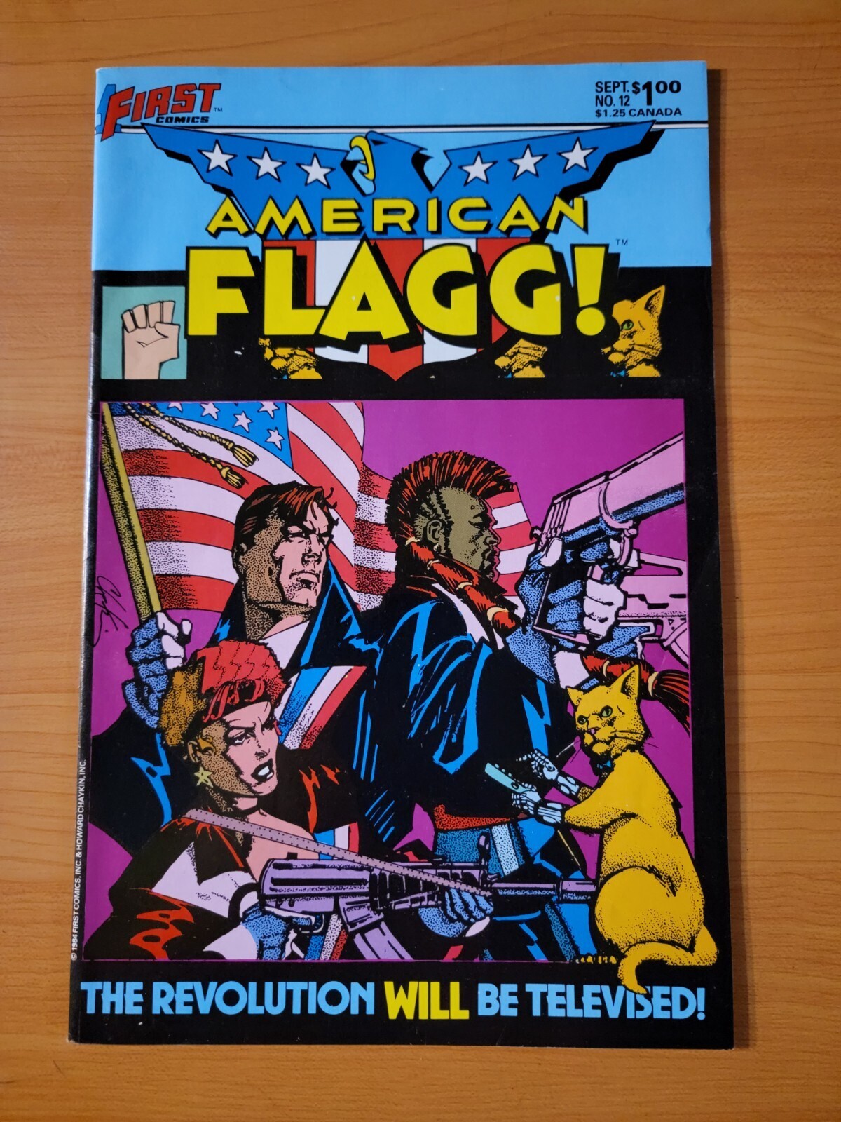 Item DescriptionAmerican Flagg! #12Publisher: First ComicsPublished: 1984Item Grade/ConditionGrade: NEAR MINTFor more information about this grade and other grades, please see our grading standards.~ WE TAKE HIGH DEFINITION PICTURES OF OUR COMICS ~ For more detail use the ZOOM Function and check them out yourself! ~Shipping Info:United States: Comic Book & Magazine Orders of all sizes, big and small ship for a flat Single Shipping ChargeInternational: We use Calculated Shipping! ~ This insures that you get the LOWEST POSSIBLE COST! ~ Please give us one business day to calculate large orders! The Calculator for Hip is pretty bad for international, contact us if you are looking to order multiple books so we can help you make it work on the back end! As a courtesy to our customers, we insure all orders over 50$ US ~ YOU DONT PAY EXTRA!Delivery TimeWe process and ship all orders within 1 business days. Once shipped, estimated U.S. transit time is 2-10 business days; international 14-21 business days.(Orders placed on Friday afternoon as well as weekends will be shipped the next business day as we do not ship on the weekends).PackingOmnomax Traders has mastered packing to ensure our orders of a "damage-free transport."Using the following methods, we have seen a nearly perfect 99% success rate for undamaged comics!Here is how our orders ship:All Orders :Bagged AND Boarded, ALWAYS NO EXCEPTIONS!Shipped in a Gemini Comic Mailer OR Tightly secured between 4x stiff pieces of corrugated cardboard (double Sandwiched)Sealed on all 4 sides with strong packing tape (Items doesn't even wiggle).:*Now this method is nearly perfect! however we have seen damage happen to items ( only once or twice a year ) ~ this is often due to bad handling by the postal service. Always remember to contact us if this happens! we are committed to quality service!*Offers History
