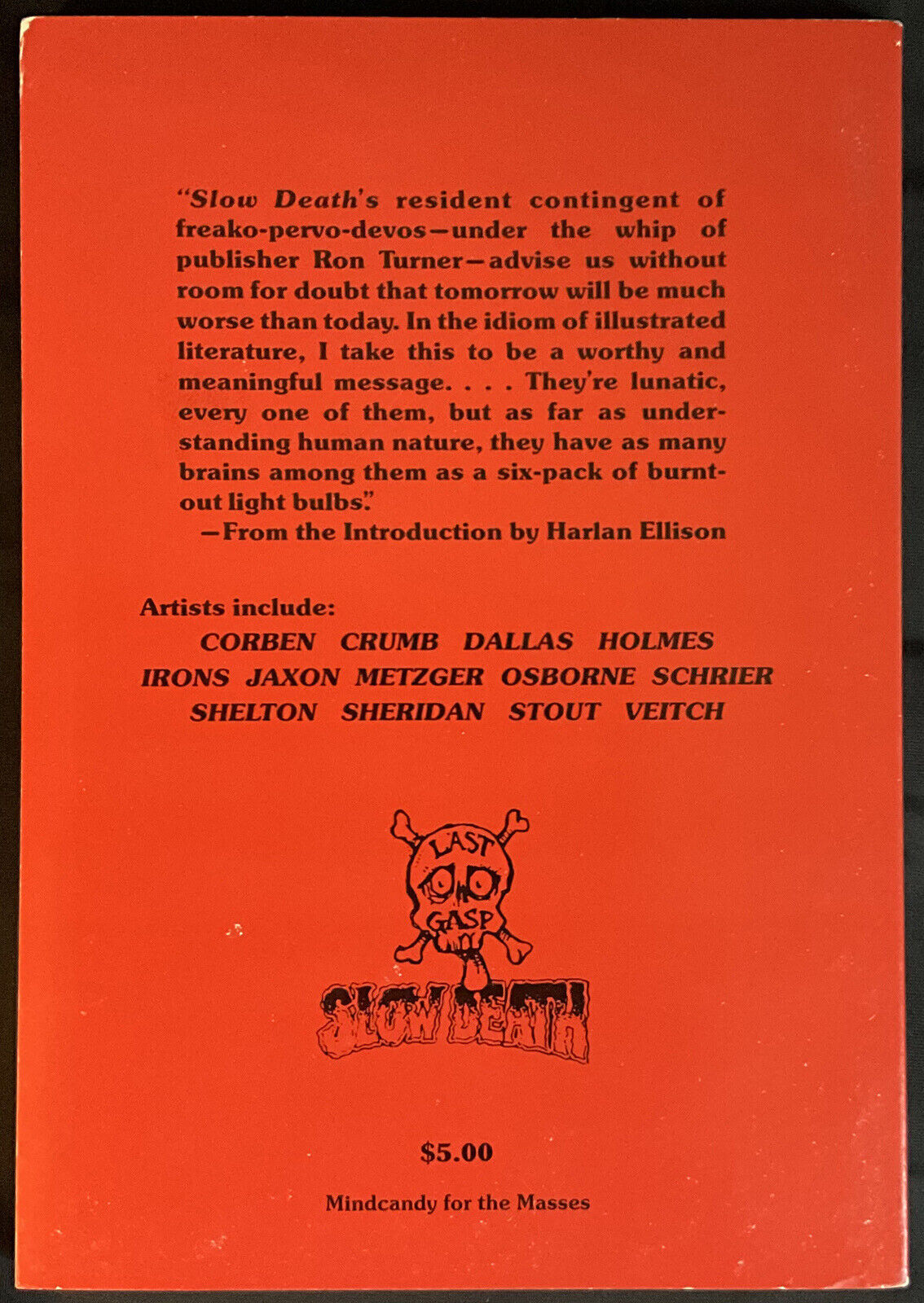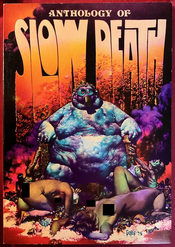 ANTHOLOGY OF SLOW DEATH nn - 8. 5, WP - Softbound - Corben - Crumb DESCRIPTION:This beautiful, unrestored softbound book is complete, fully readable with both covers attached. The book has very high cover gloss, a very tight spine and white pages. Richard Corben cover and stories. 2 page robert Crumb story The book ships in a mylar sleeve along with an acid free backing board. Condition is a very conservatively graded - 8.5, VFN+. *You must be 18 years of age or older to bid on this auction*SHIPPING INFORMATION:Combine our auctions and $ave on shipping!Please remember that Media Rate may take up to 4 weeks delivery.FEDEX services available.Nevada residents, please add sales tax.We accept PayPal, MasterCard, Visa, Discover, American Express.NOTES AND FINE PRINT: Welcome to Redbeard's Book Den! For most that have collected comic books for the last 30 years, you have probably heard of us. Redbeard's founder and current owner is Ron Pussell (aka Redbeard), senior Overstreet Price Guide consultant since 1980.REDBEARD'S BOOK DENPO Box 217Crystal Bay, NV 89402-0217 _gsrx_vers_1653 (GS 9.7.5 (1653))