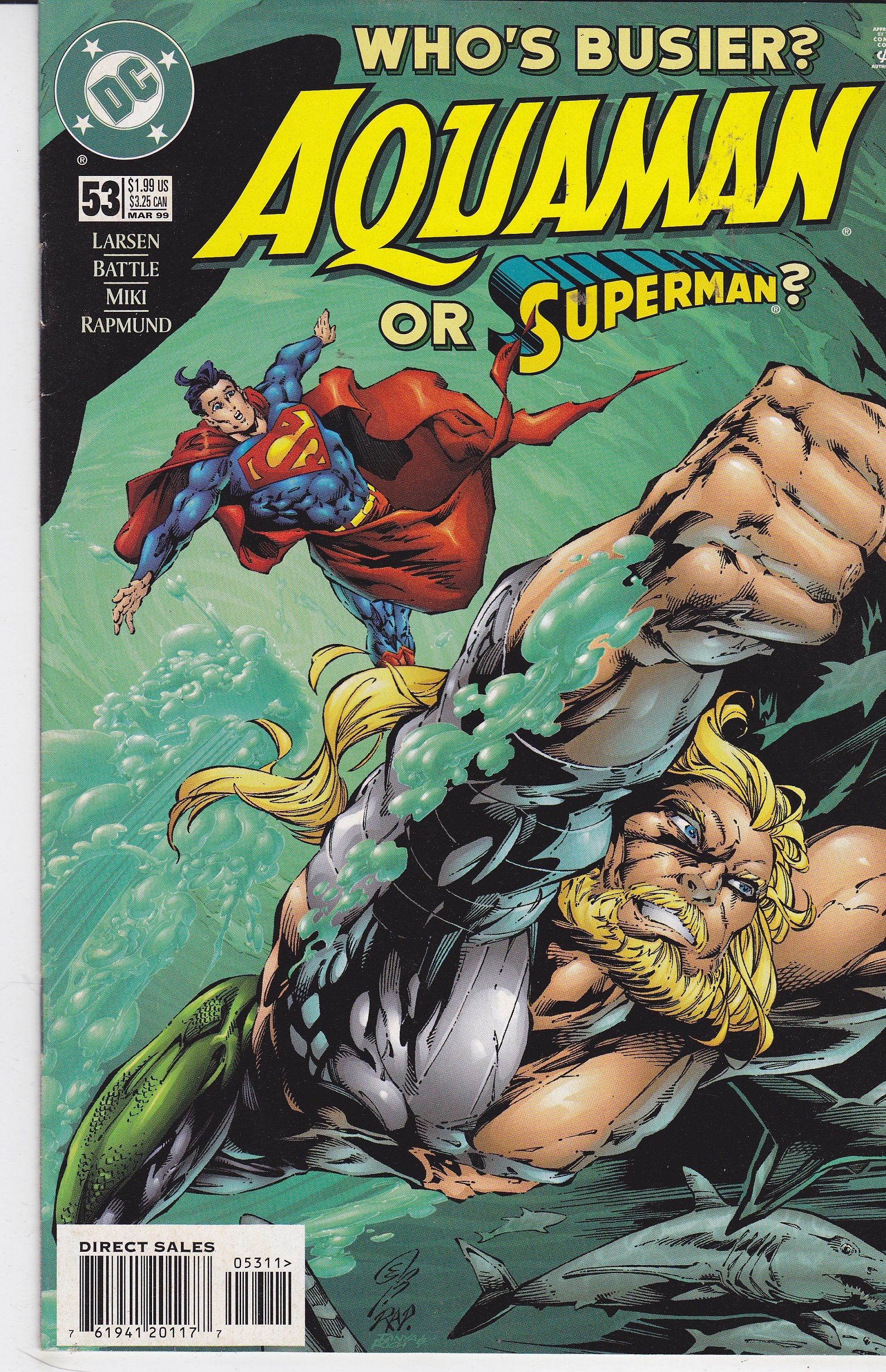 Aquaman #53 by DC Comics copyright 1999. I have graded the comic book, using the Overstreet Grading Guide, at FINE/VERY FINE with the following defects: A couple of light stress marks along the spine. The corners are rounded. There is some light yellowing of the pages.Seller Information