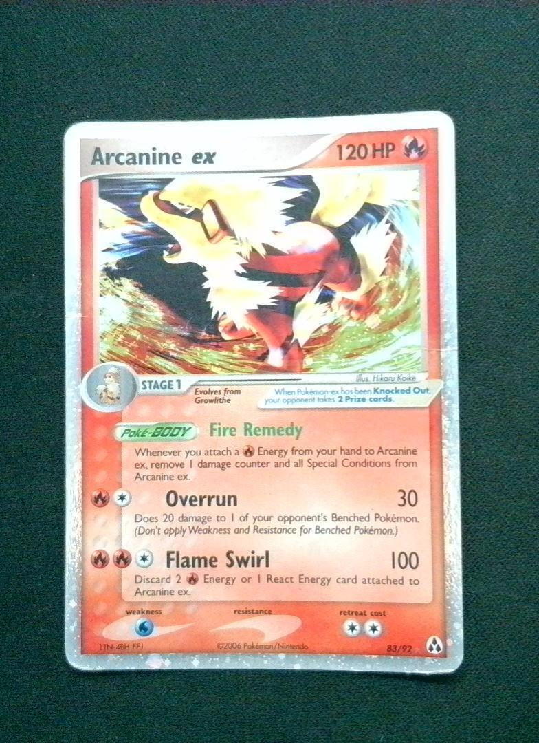 Arcaine ex Fire-type Stage 1 Pokémon card with 120 HP from the EX series (card #83/92). Features the Poké Body ability Fire Remedy, which removes 1 damage counter and all Special Conditions from Arcaine ex whenever ... Read More