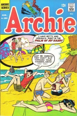 Item: Archie #184 | Publisher: Archie | Cover Date: August 1968 | Writer: Frank Doyle, Joe Edwards | Artist: Harry Lucey, Joe Edwards | Cover Artist: Dan DeCarlo | Appearances: Archie Andrews, Jughead Jones, Miss Grundy, Betty Cooper, Veronica Lodge, Reggie Mantle, Hiram Lodge (Veronica's dad), Moose Mason, Pop Tate, Li'l Jinx, Hap Holliday (Li'l Jinx's dad) | Storylines: Hard Choice; Soap Opera; Tickets to Trouble; Down and Out!; Dog Daze | Notes: Beach bikini cover | With Economy shipping, each additional comic ships for just 50 cents more to customers in the USA. This listing contains a stock photo and information from ComicBase™ and © Human Computing. The stock photo is for reference only. If you would like to see a photo of the actual item, please message us prior to purchasing.Seller Information