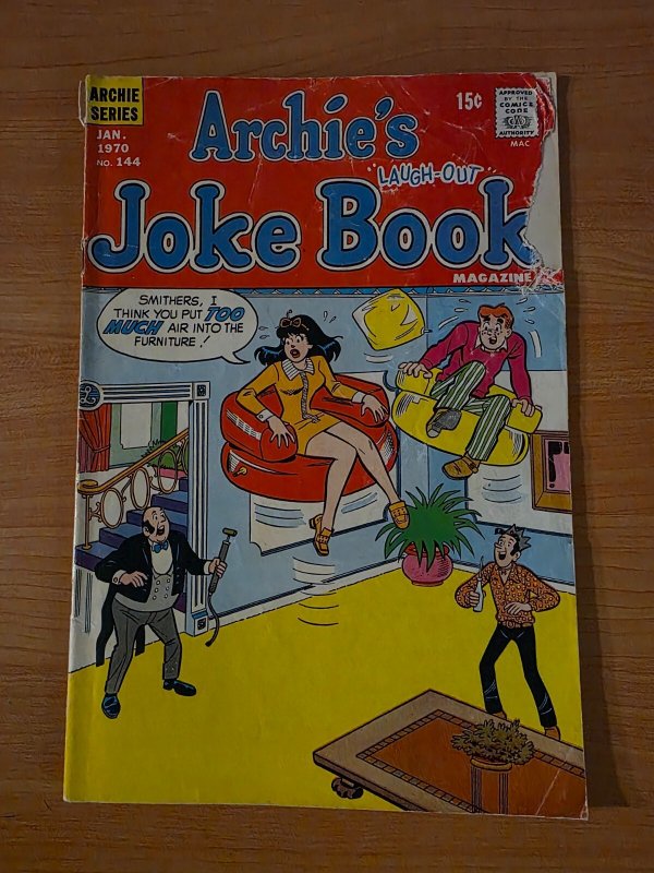 Item DescriptionArchie's Joke Book #144Publisher: Archie ComicsPublished: 1970Item Grade/ConditionGrade: DOLLAR BIN (No Grade Assessment Done, see pictures!)DISCLAMER: While there absolutely are NM books in our dollar bin, many will be low to mid grade. please do not assume minty books these are great for reading and kids but less so for collectors where condition matters! ?For more information about this grade and other grades, please see our grading standards.~ WE TAKE HIGH DEFINITION PICTURES OF OUR COMICS ~ For more detail use the ZOOM Function and check them out yourself! ~Shipping Info:United States: Comic Book & Magazine Orders of all sizes, big and small ship for a flat Single Shipping ChargeInternational: We use Calculated Shipping! ~ This insures that you get the LOWEST POSSIBLE COST! ~ Please give us one business day to calculate large orders! The Calculator for Hip is pretty bad for international, contact us if you are looking to order multiple books so we can help you make it work on the back end! As a courtesy to our customers, we insure all orders over 50$ US ~ YOU DONT PAY EXTRA!Delivery TimeWe process and ship all orders within 1 business days. Once shipped, estimated U.S. transit time is 2-10 business days; international 14-21 business days.(Orders placed on Friday afternoon as well as weekends will be shipped the next business day as we do not ship on the weekends).PackingOmnomax Traders has mastered packing to ensure our orders of a "damage-free transport."Using the following methods, we have seen a nearly perfect 99% success rate for undamaged comics!Here is how our orders ship:All Orders :Bagged AND Boarded, ALWAYS NO EXCEPTIONS!Shipped in a Gemini Comic Mailer OR Tightly secured between 4x stiff pieces of corrugated cardboard (double Sandwiched)Sealed on all 4 sides with strong packing tape (Items doesn't even wiggle).:*Now this method is nearly perfect! however we have seen damage happen to items ( only once or twice a year ) ~ this is often due to bad handling by the postal service. Always remember to contact us if this happens! we are committed to quality service!*Offers History