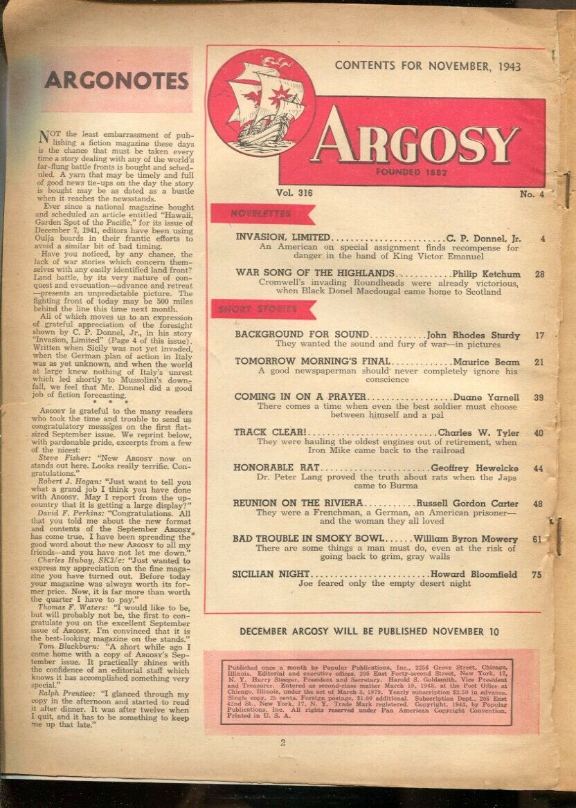 Argosy 11/1943-Popular-Rafael DeSoto cover-pulp thrills-bed-sheet format-Don ...