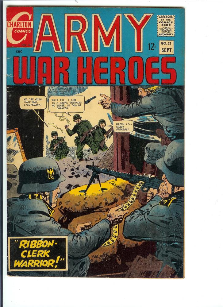 Army War Heroes, Volume 1, #21, September, 1967. Condition Fine (Est. Overstreet Price guide Value @FN $9.00, Selling this one for only $6.95). Featuring "RIBBON-CLERK WARRIOR!". This is a Very Nice Copy to have.Featuring: "The Hunter"; "Alles Kaput"; "Nobody's War"; "Ribbon-Clerk Warrior"; and an untitled 1-page Always Alert text article! 36 pages, full color. Cover price $0.12.
