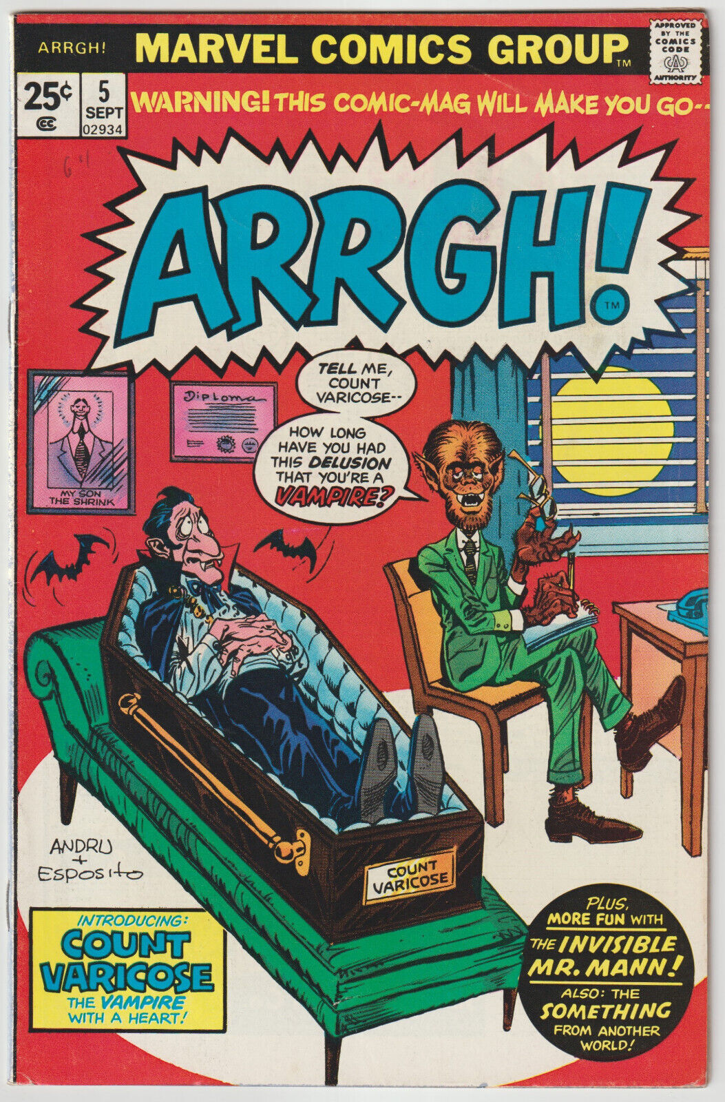 Arrgh! #5 (Sep 1975, Marvel), FN-VFN (7.0), Count Varicose & Invisible Mr. Mann