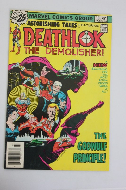 Grade: VFAstonishing Tales #36 (1976) Deathlok. This comic is in VF condition. This is a quickly assessed grade. Please feel to ask any questions. We do accept returns if you feel the grade is off. Combined Shipping is offered but it must be addressed after the purchase due to the shipping settigns we use. WE refund 3.96 per issue for shipping after the first comic or magazine purchased