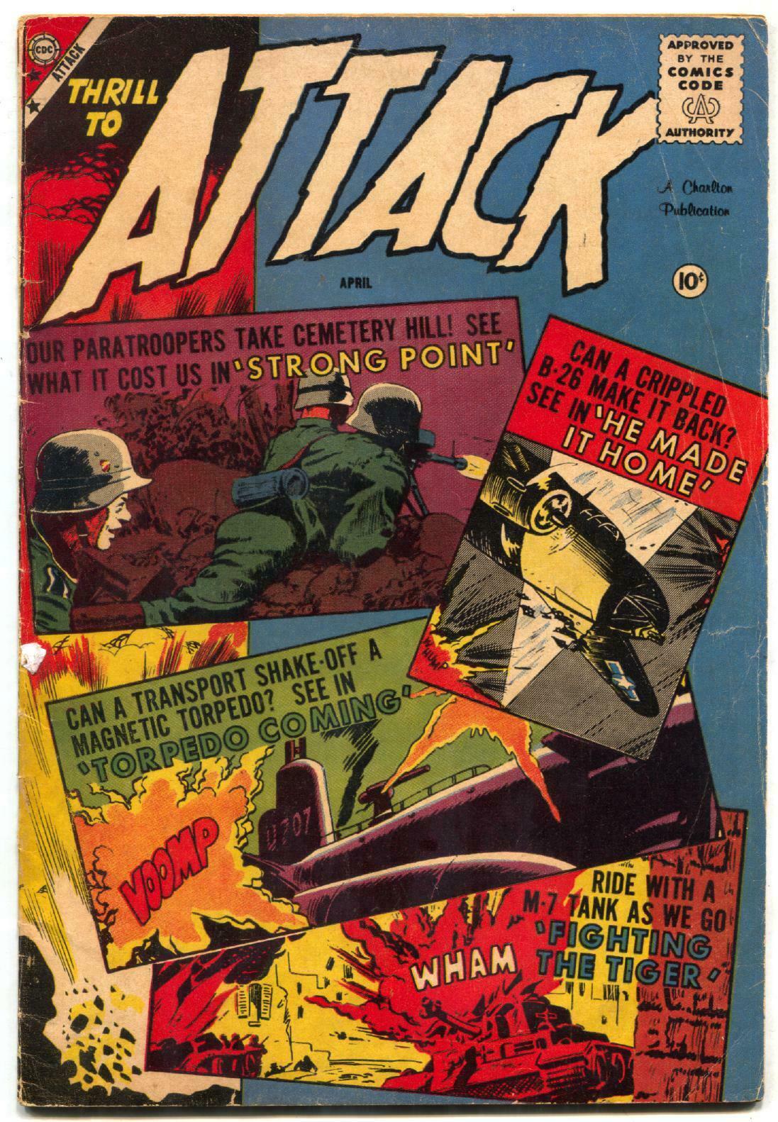 Attack Issue: 57 / Year: 1959 Condition: VGSam Glanzman art. Publisher: CharltonSku: DO-47-110 Over 100,000 mail orders processed! Buy with confidence. Track Page Views WithAuctiva's FREE Counter