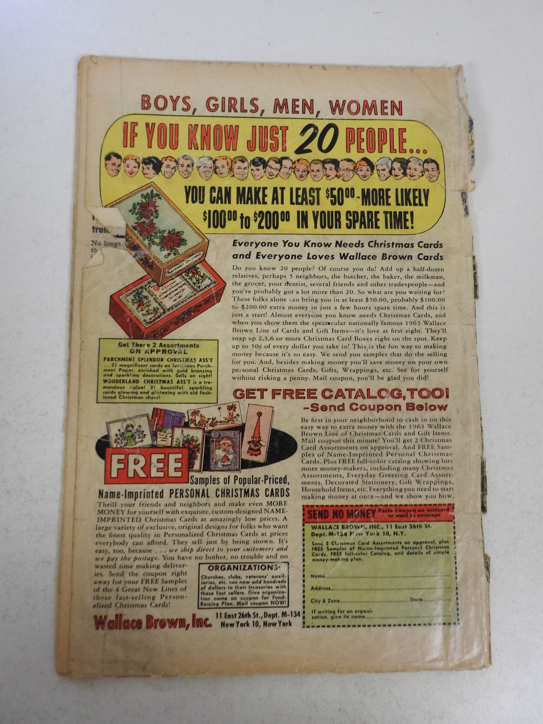 ink fc and 1st page, 2 in spine split, 1 1/2 in tear fc, 1 1/2 in tear bc