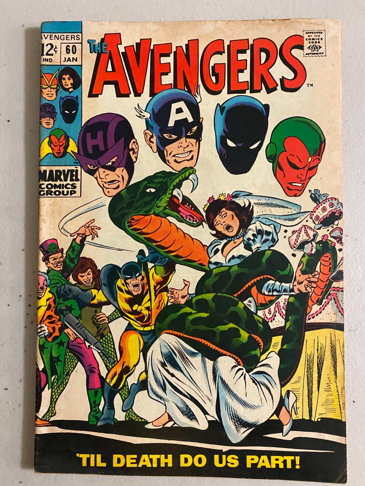 Avengers #60 (1969). 4.0 VG, cover discoloration.Please be sure to check our other exciting listings. Lot buyers: quantity of books (as described in item title and shown in photos). Unless an item description says SET or RUN it does not contain all consecutive books. Some items say VARIANTS so some variant covers are included which are duplicate issues in the storyline. With over 40 years of experience we expertly and professionally pack and ship your order maximizing item protection. Shipping is $5.99 for singles. We can ship up to four singles with combined shipping. For lots each 50 books is $14.99 per box. Shipments may also be expedited for an extra charge if you contact us first. Otherwise all orders ship within 2 business days, usually next business day. Satisfaction Guaranteed:If you do not feel you have received good value for your money, we offer free returns.