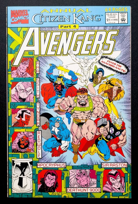 Avengers Annual #21 is a key issue as it marks Part 4 of the "Citizen Kang" storyline and features the first appearance of the Anachronauts, a group of time-displaced warriors assembled by Kang the Conqueror. These characters, including Apocryphus, Deathunt 9000, Raa, Sir Raston, Ssith, Tyndar, and Wildrun, play significant roles in Kang's plans and the ongoing battle against the Avengers.This annual serves as a pivotal point in the overarching storyline involving Kang's manipulation of time and space, showcasing his ambition and the threats he poses to the Marvel Universe.