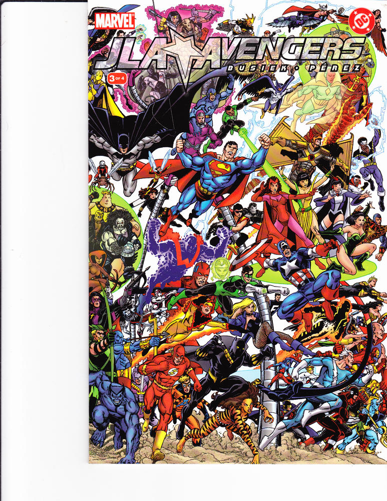 Avengers/JLA #3 by Marvel/DC Comics copyright 2003. I have graded the comic book, using the Overstreet Grading Guide, at VERY FINE/NEAR MINT with the following defects: Couple of light stress marks along the spine. The corners are starting to round. There is light yellowing of the pages.