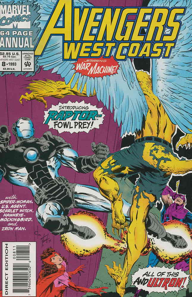 Item: Avengers West Coast Annual #8 | Publisher: Marvel | Cover Date: 1993 | Writer: Roy Thomas | Artist: Kris Renkewitz, Dave Ross, Scott Kolins, Larry Alexander, John Czop, Vince Russell, Barry Kitson | Cover Artist: Dave Ross | Appearances: Raptor | Storylines: If Volcanic Winter Comes; The Gathering; Let Us Prey!; Northern Explosion!; Mexican Bake-Off!; Fuss and Feathers; More and Less Than Human | Notes: 1st Appearance of Raptor; Origin Raptor; No card | With Economy shipping, each additional comic ships for just 50 cents more to customers in the USA. This listing contains a stock photo and information from ComicBase™ and © Human Computing. The stock photo is for reference only. If you would like to see a photo of the actual item, please message us prior to purchasing.Seller Information