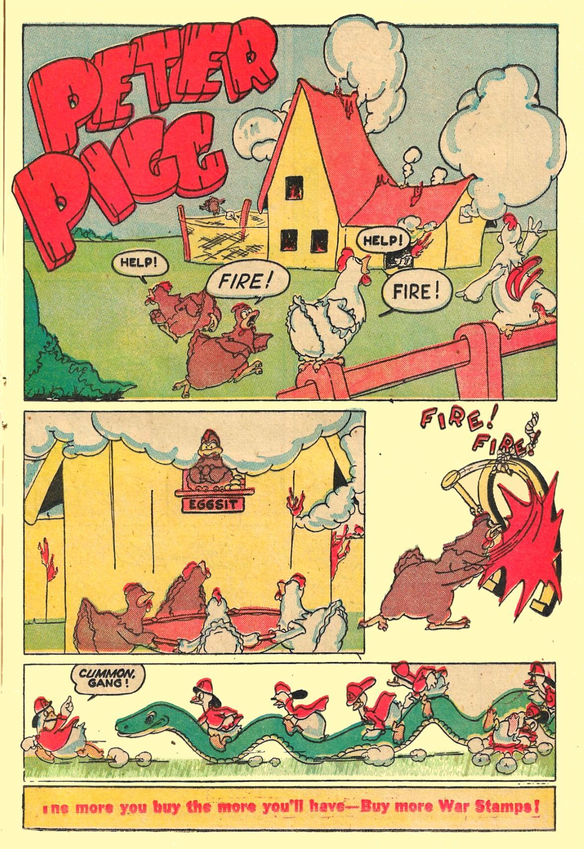 BARNYARD COMICS debuted in June 1944, as a clever moonlighting gig for the cartoonists spending their days animating at TERRYTOONS studio, and a few smaller, New York-area animation shops. Organized by Ned Pines, the various funny animal artists submitted their own stories, and they were compiled in a number of different comic books under the STANDARD COMICS banner.Here in the premiere issue of BARNYARD COMICS, Pines was pretty much running anything up the flagpole, hoping someone would salute . . or that one or more characters would prove popular enough to be standouts! So you get characters as varied as Torchy the Little Red Duck, Sappy the Sportsman, Peter Pigg (who actually became a recurring feature), Hetty Hepcat, Chippy Chipmunk, Simp Squirrel and others, in the 52 pages that provide a cornucopia of varied art talents!