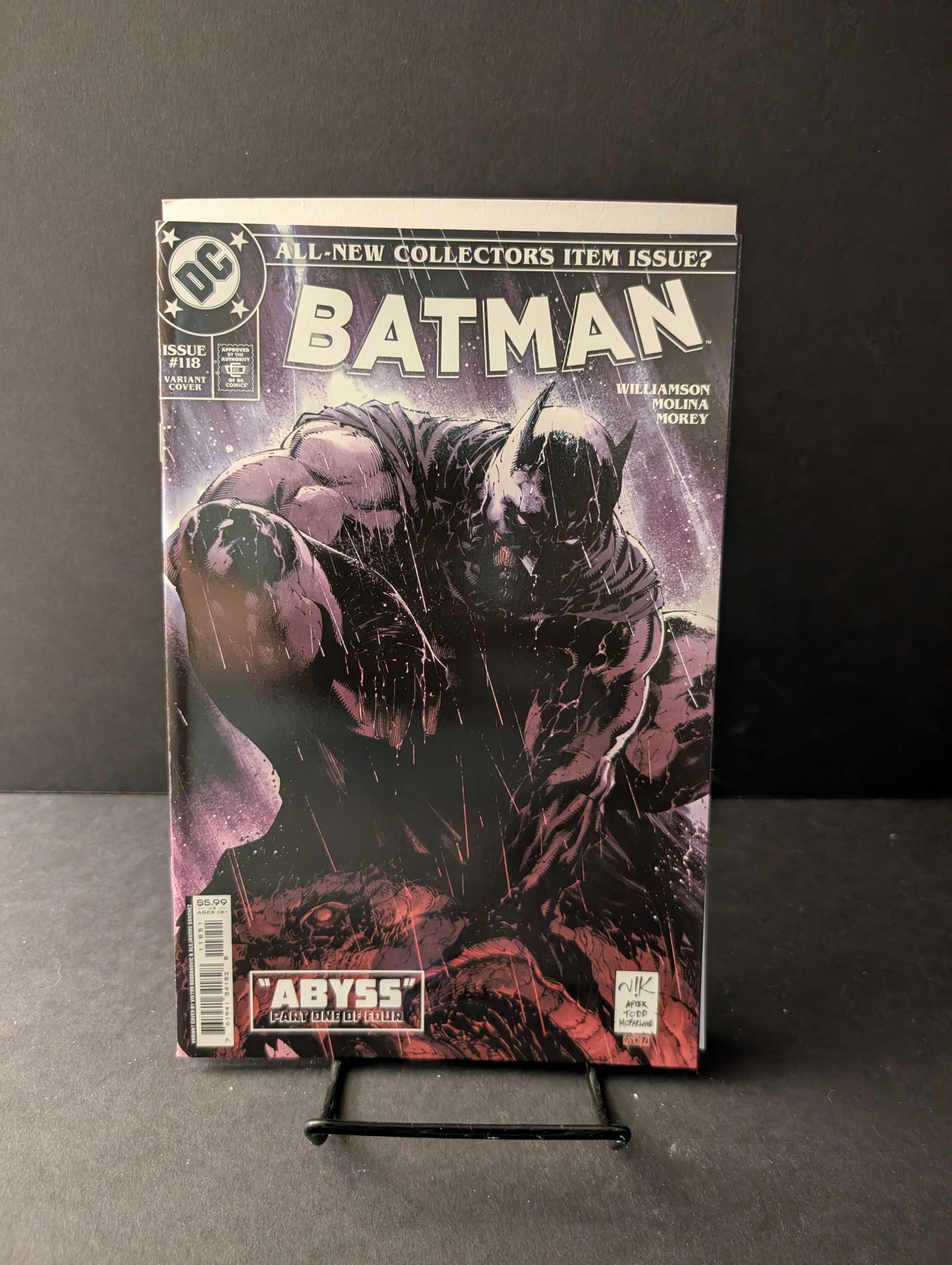 Abyss: Part 1 - Written By Joshua Williamson. Art by Jorge Molina. Cover by Viktor Bogdanovic. New creative team! Start of a new story arc as Batman leaves Gotham! As Gotham celebrates surviving Fear State, Batman retreats alone into the darkness. But when he learns of a mystery involving Batman Inc., it forces the Caped Crusader to leave Gotham for a brand-new adventure! Thrills, chills, and international intrigue await! The Dark Knight begins a new story with superstar artist Jorge Molina and new writer Joshua Williamson! 40 pages, full color. Rated T+ Cover price $5.99.Seller Information