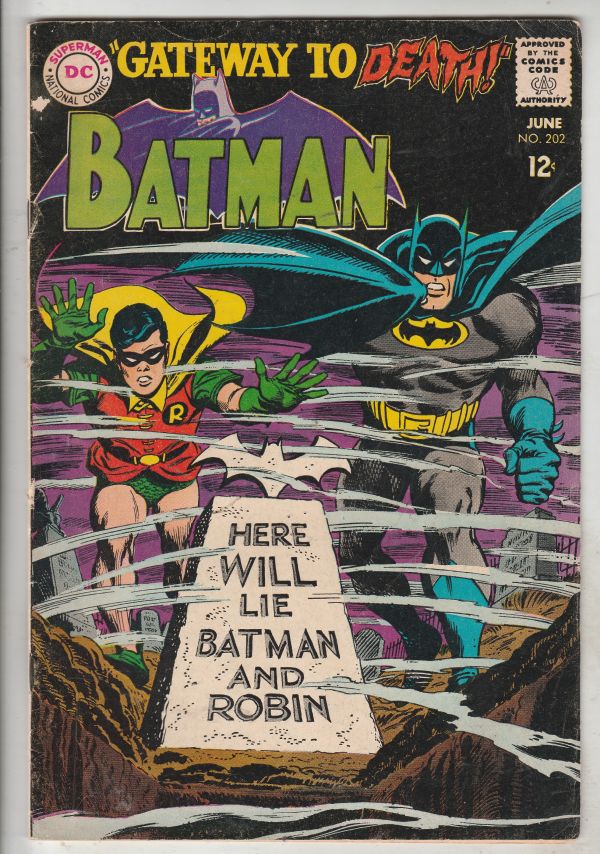 Batman #202 - Here Will Lie Batman and Robin APPEARANCE - Robin solo story. APPEARANCE - Motorcycle gang. Wow! This book has deep rich color and sharp eye-appeal on this all-time-classic hard-to-get-in-high-grade ... Read More