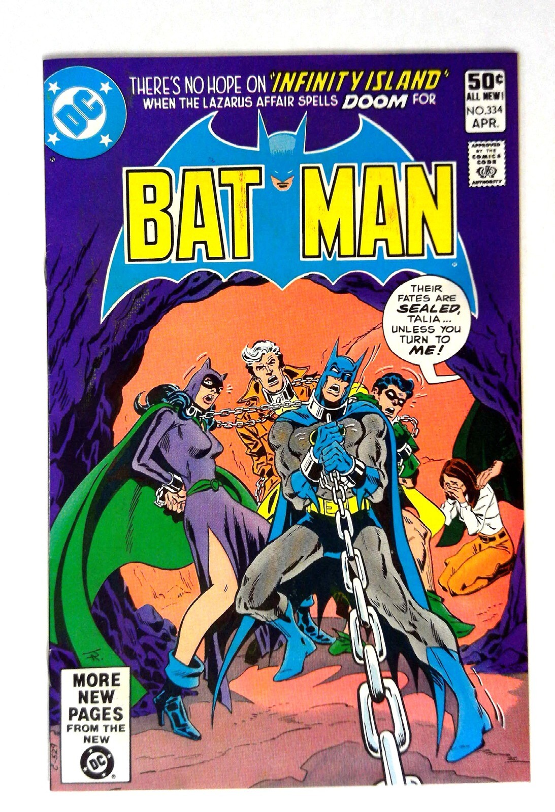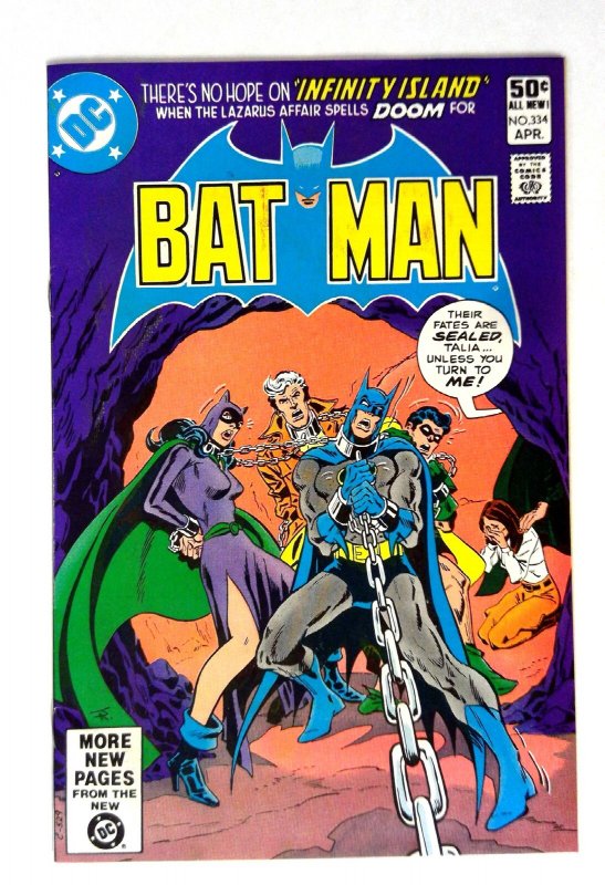 Batman #334 (1981) VF/NM Batman DC Batman Batman, Catwoman, Robin, and Talia al Ghul are depicted in chains, set against the backdrop of 'Infinity Island'. This issue involves the dramatic 'Lazarus Affair' storyline. TITLE: Batman ISSUE: 334 GRADE: VF/NM SKU: VE-33-011Seller Information