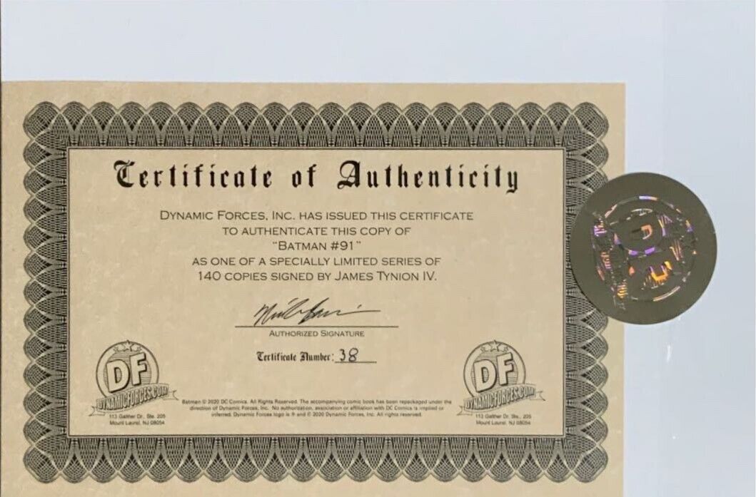 Grade: 9.2 Near Mint- Batman #91 jorge jiminez cover signed by james tynion iv w/coa.Near mint bagged and boarded.