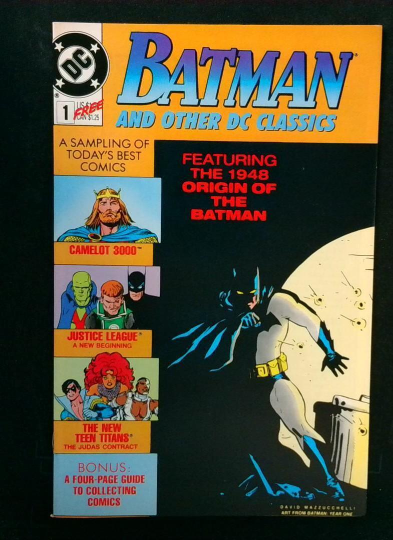 This comic, "Batman and Other DC Classics," showcases a variety of notable DC stories, including the 1948 origin of Batman. It features appearances from popular series such as "Camelot 3000," "Justice League," and "The New Teen Titans." The comic also includes a bonus four-page guide to collecting comics, making it a unique and informative addition to any collection.