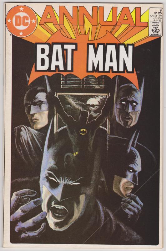 Batman Annual #9 by DC Comics copyright 1985. I have graded the comic book, using the Overstreet Grading Guide, at VERY GOOD/FINE with the following defects: Light stress marks along the spine. The corners are rounded. There is a fold in the lower right corner. There is yellowing of the pages.Seller Information