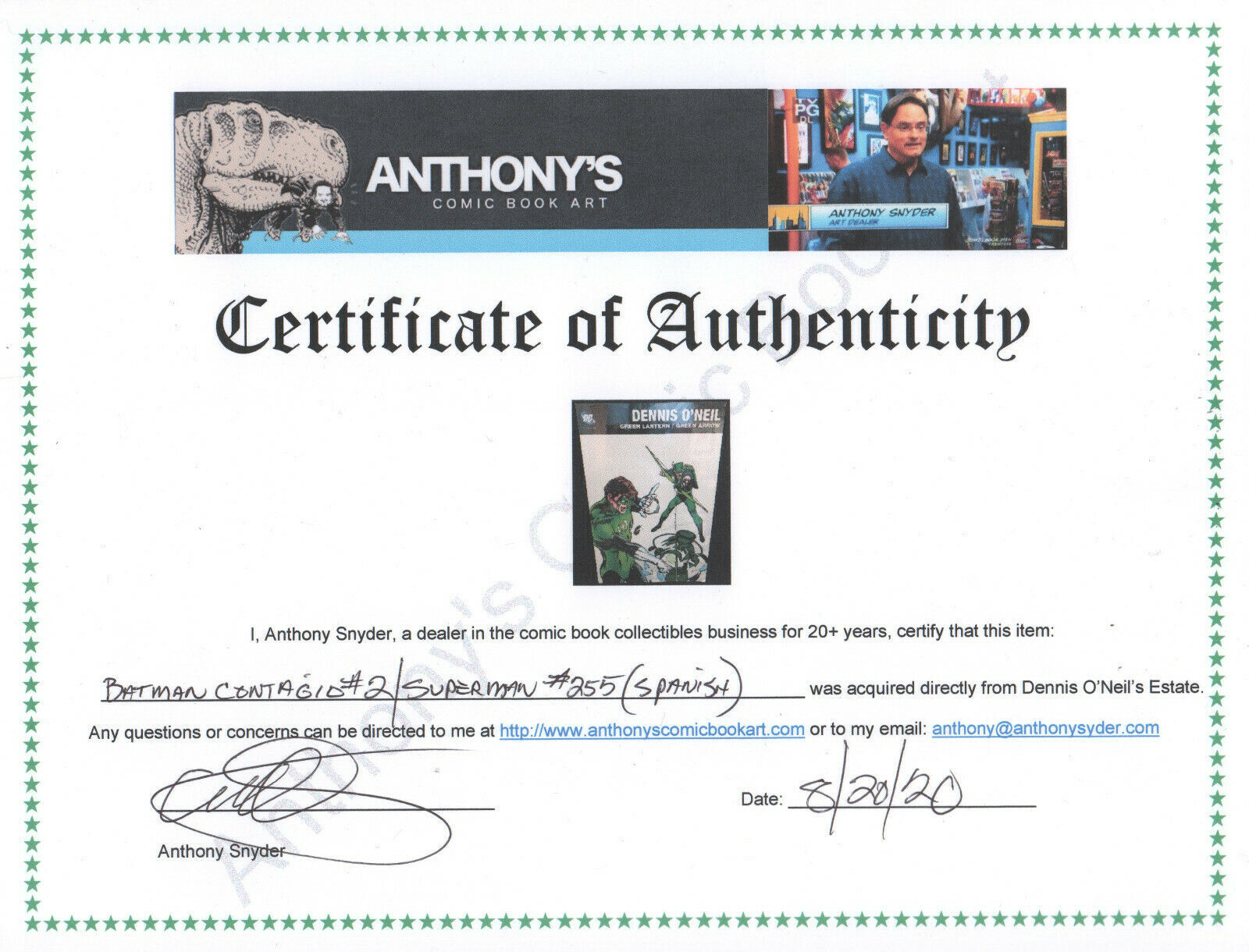 Grade: 8.0 VFBatman Contagio #2 & Superman #255 Spanish Comic Books 2pc Lot (8.0) Dennis O'Neil File CopySize: 7" x 10"I acquired this personally from the estate of Dennis O'Neil. Included with your purchase will be a COA signed by me stating where it came from.This item was uploaded by Bobby.WE COMBINE SHIPPING!!! Either wait for us to send you an invoice after you commit to buy or, if it makes you pay right away, message us back and we'll refund the excess charge. Buy as many single comic books as you want for one low flat shipping rate in the United States! International will be charged exact according to size and weight. If you have any specific questions or requests, please ask us prior to ordering and we'll get back to you as soon as we can. If there are any problems with your order whatsoever, please message us before leaving feedback and we'll be happy to work with you to fix the situation! We ship worldwide, combine purchases, and charge exact shipping. The price may vary based on size, weight, and location. If you are automatically overcharged for shipping, message us and we'll be happy to revise the invoice or refund you the excess amount. If you have any questions regarding shipping, please message us. International Buyers - Please Note: Import duties, taxes, and charges are not included in the item price or shipping cost. These charges are the buyer's responsibility. Please check with your country's customs office to determine what these additional costs will be prior to bidding or buying. Payment can be made by PayPal and credit cards directly. 120,000+ items in total in my Hip store! Frequently Asked Questions: When are your operation hours?Our in office hours are Monday - Friday, 11 am - 8 pm. We are not open on weekends, so if you send us a request on Friday evening we won't get back to you until Monday afternoon. Please don't take it as us ignoring you! We will work on your request Monday and get back to you as soon as we can. Also, if you order from us on a Friday evening or Saturday morning we won't start processing your order until we open on Monday. That means on Monday it will be pulled and prepped for shipping, then picked up by the postman on Tuesday morning.When will you ship my item? The tracking hasn't moved.We realize you're eager to get your item, so if the tracking hasn't moved in a few days please don't be concerned. We give the postman a lot of packages daily, sometimes as many as 100, so he does not scan each item for us upon pickup as he says it would be too time consuming for him to do so. If you get a tracking number from us, that almost always means your item was picked up by the postman the next business day. The USPS is also imperfect. There are times when the tracking won't even show movement until it's in your area's regional distribution center. This is normal in our experience. Is the item pictured the exact one for sale?Yes! We don't use stock images and go through great lengths to scan or photograph everything we list. The item pictured is exactly what you should receive UNLESS it is a fixed price listing with multiple items available. Can you issue a COA? We can, upon request. Please make sure you leave us a note while checking out and shoot us a message immediately after requesting one, just to be sure. How do you grade?Grading is very subjective, but we are professionals with decades of grading experience between us who try the best we can to accurately describe the condition of the items we list. Anthony is an Overstreet Comic Book Price Guide Advisor Please see the grading chart below for a breakdown of how we grade: NOTE: We don't grade any raw books higher than 9.2, as once you go higher than that grading gets really subjective. If you buy a NM book from us, it may very well be higher than 9.2 but we play it safe and grade conservatively. 9.2 NM Near Mint 9.0 VF/NM Very Fine/Near Mint 8.5 VF+ Very Fine+ 8.0 VF Very Fine 7.5 VF- Very Fine- 7.0 FN/VF Fine/Very Fine 6.5 FN+ Fine+ 6.0 FN Fine 5.5 FN- Fine- 5.0 VG/FN Very Good/Fine 4.5 VG+ Very Good+ 4.0 VG Very Good 3.5 VG- Very Good- 3.0 GD/VG Good/Very Good 2.5 GD+ Good+ 2.0 GD Good 1.8 GD- Good- 1.5 FR/GD Fair/Good 1.0 FR Fair 0.5 PR PoorHow do you ship comics? We ship in rigid cardboard mailers to protect your comic book from the worst the mail system has to offer. Price varies based on the number of books you purchase, but we try to keep costs as low as we can and charge exact shipping. If it looks unusually high to you please send us a message and we'll be happy to double check for you. Do you combine shipping? Yes, of like items. Such as: several comics can fit in one cardboard mailer, as can more than one record. Multiple art pages can easily be combined because they are light and thin. Where combined shipping differs is with size and weight. For instance, two statues require a much bigger box. Same goes for CGCs, as the package gets bigger and heavier as you go. Do you ship well? I've had some bad experiences... You needn't worry; we are professionals who value your business and want your item to arrive safely as much as you do. I have been collecting for over 30 years. I send out items the way I would like to receive them. The tracking says my item is "OUT FOR DELIVERY" in New Jersey. Why is that?If the tracking indicates that the item is "OUT FOR DELIVERY" in NJ don't worry, it's just what the tracking says when it's carried over from the postman to the sorting center. This is normal for our Post Office and will not impact you receiving your item in a timely matter.What is the difference between a RUN and a LOT?Good question. A RUN will be a collection of consecutive issues with no breaks in between them. If it says RUN of #s 1 - 50 you will receive 50 consecutive comics. A LOT will be within a certain range, so a 50pc LOT will not contain consecutive books.I changed my mind after successfully winning the auction or fixed price listing, will you cancel the transaction? Please on