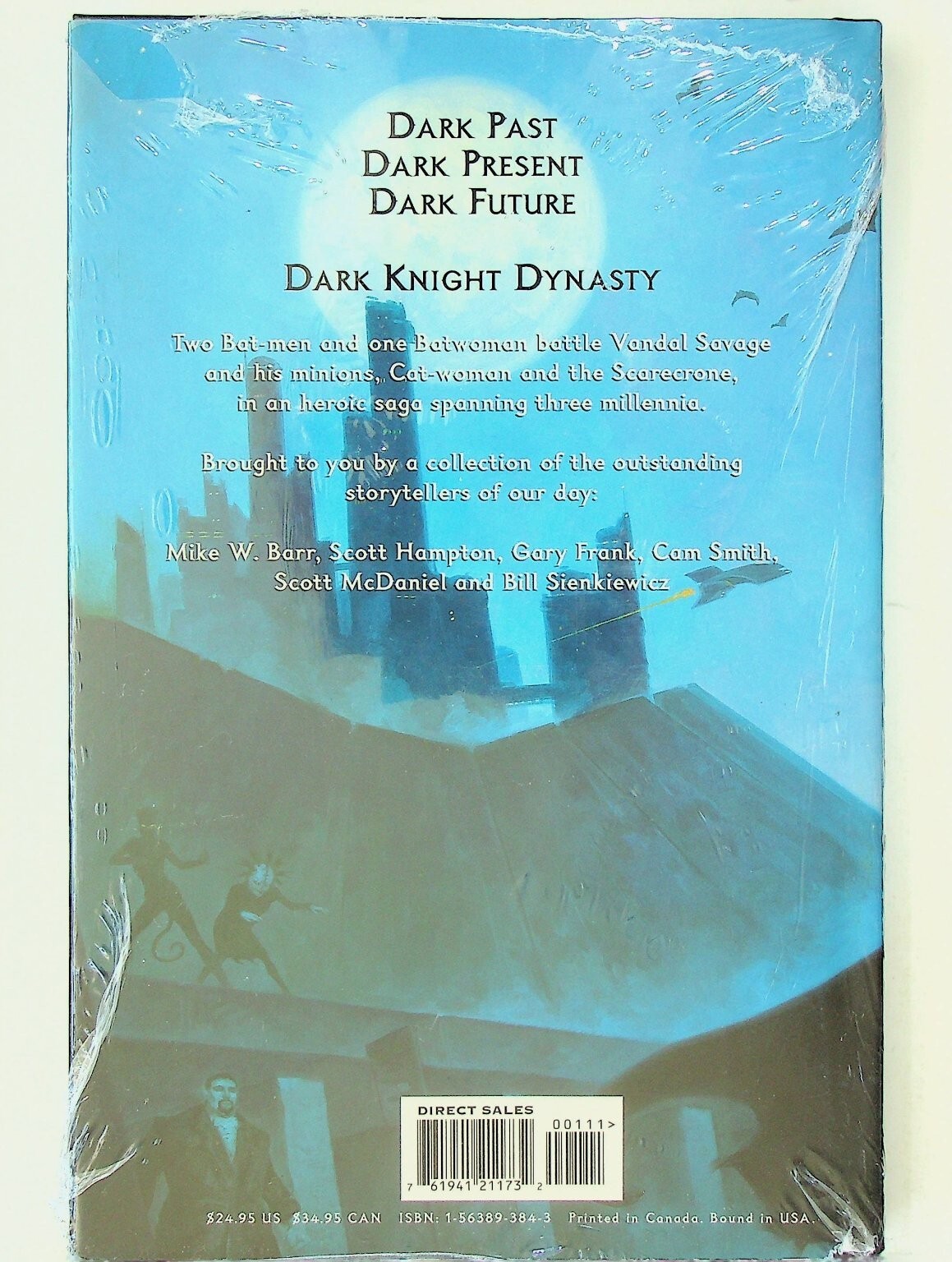 This is a collected graphic novel edition titled "Batman Dark Knight Dynasty" published by DC Comics under their Elseworlds imprint. This compelling story spans three millennia, featuring two Bat-men and one Batwoman as they battle Vandal Savage, Catwoman, and Scarecrone. It compiles the work of a talented team of creators including writers and artists such as Mike W. Barr, Scott Hampton, Gary Frank, Cam Smith, Scott McDaniel, and Bill Sienkiewicz.This listing includes one (1) graphic novel, still in its original polybag packaging. The back cover prominently displays the story's premise and lists the contributing creators, making it a valuable addition for collectors of Batman and Elseworlds stories. The book features a Direct Sales barcode and has a cover price of $24.95 US / $34.95 CAN, with ISBN 1-56389-384-3.Verified Specifications:Publisher: DC ComicsSeries Title: BatmanStory Title: Dark Knight DynastyItem Type: Graphic NovelEra: Modern AgeFormat: Direct EditionKey Features: Elseworlds Story, Collectible, New/Sealed in PolybagIncluded Components: 1x Graphic NovelCountry of Origin: USA (Bound in USA)Artist/Writer: Mike W. Barr, Scott Hampton, Gary Frank, Cam Smith, Scott McDaniel, Bill SienkiewiczUnit Quantity: 1Unit Type: BookUnit of Sale: Single UnitSeller Information