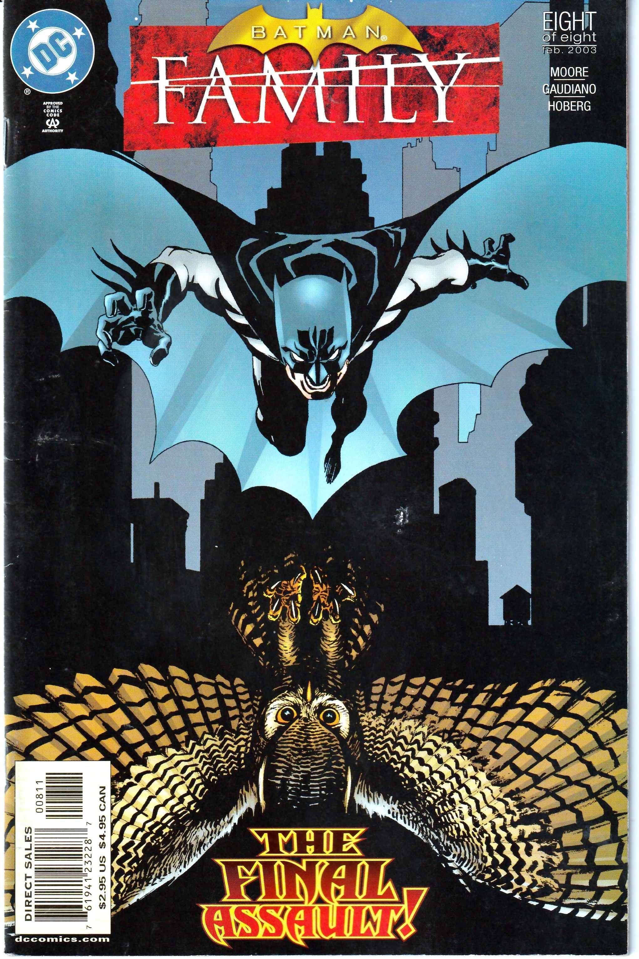 Batman: Family #8 (2003)Very Fine condition - Few chinks on front and back of spine but cover and interior pages in pristine condition. BATMAN, ROBIN, NIGHTWING, ORACLE, BATGIRL, SPOILER, BLACK CANARY, AND THE HUNTRESS GO UP AGAINST A VENGEFUL MATRIARCH AND HER NETWORK OF OPERATIVES ! X FORCE WRITER AND 90'S FLASH TV SHOW STORY EDITOR PROVIDES STORY WITH NEWCOMER STEPHANO GAUDINO AND ALL STAR SQUADRON'S RICK HOBERG PROVIDE ART