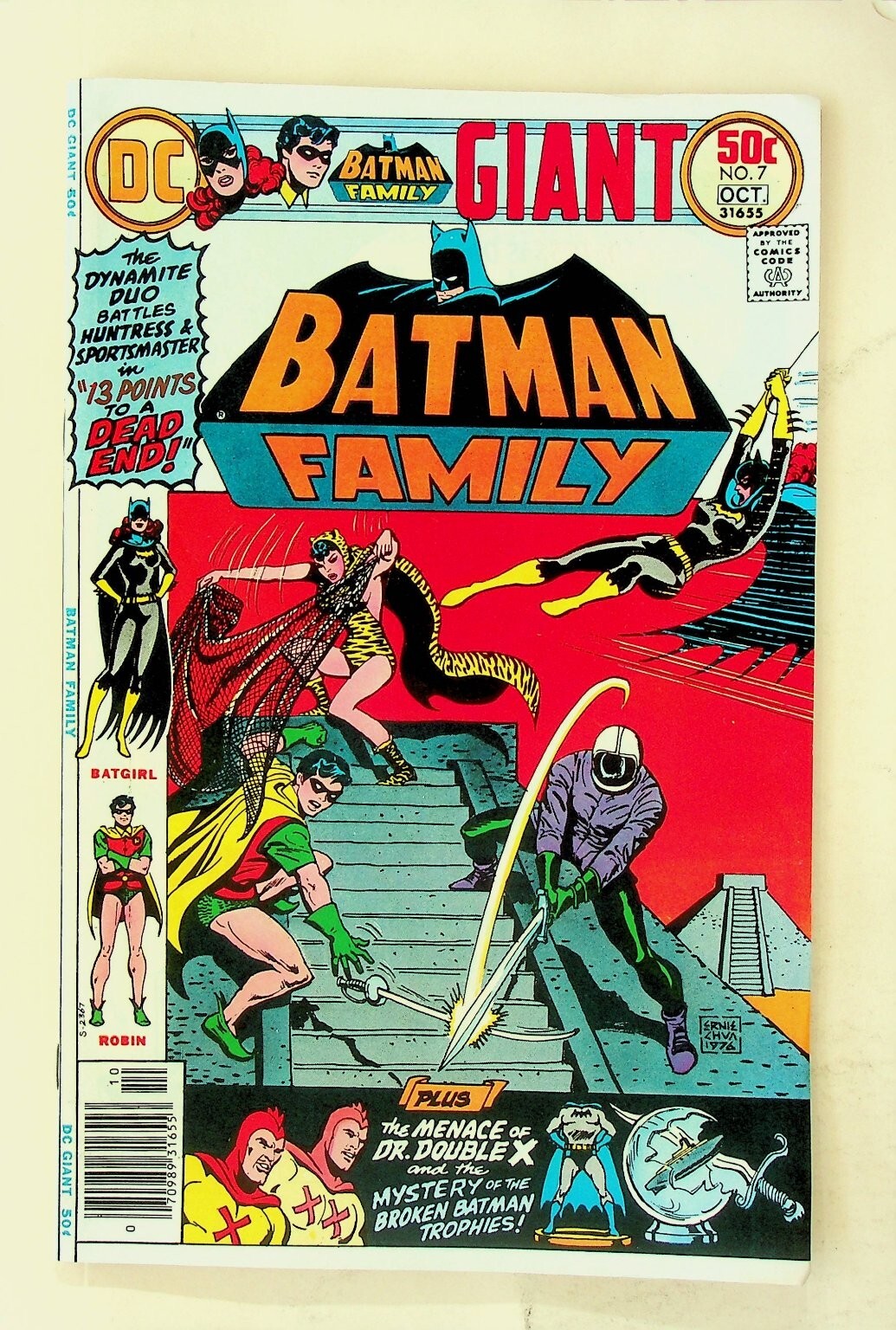 Grade: 8.0 Very FineThis is a single issue of Batman Family Giant #7 published by DC Comics. This classic Bronze Age comic features the "Dynamite Duo" battling Huntress and Sportsmaster in "13 Points to Dead End!", plus additional stories including "The Menace of Dr. Double X!" and "Mystery of the Broken Batman Trophies!". The cover price is 50¢ and it is dated October. The vibrant cover art by Jose Luis Garcia-Lopez and Bob Wiacek showcases key DC characters like Batman, Batgirl, and Robin. This is a Newsstand Edition, indicated by the visible UPC barcode on the lower left of the cover. A great collectible for fans of vintage Batman, DC Comics, and the Bronze Age era.This listing includes one (1) comic book, loose as pictured. The back cover features a vintage advertisement for "The Green Machine" by Marx Toys.Verified Specifications:Publisher: DC ComicsSeries Title: Batman Family GiantIssue Number: #7Item Type: Single IssueEra: Bronze AgeFormat: Newsstand EditionCover Type: Standard CoverKey Features: Giant IssueIncluded Components: 1x Comic BookPublication Year: 1976Cover Artist: Jose Luis Garcia-Lopez, Bob WiacekCountry/Region of Manufacture: United StatesIntended Audience: General AudienceStyle: ColorTradition: US ComicsType: Comic BookVintage: YesCharacter: Batman, Batgirl, Robin, HuntressGenre: SuperheroLanguage: EnglishSuperhero Team: Batman FamilyUnit Quantity: 1Unit Type: Comic BookUnit of Sale: Single Unit