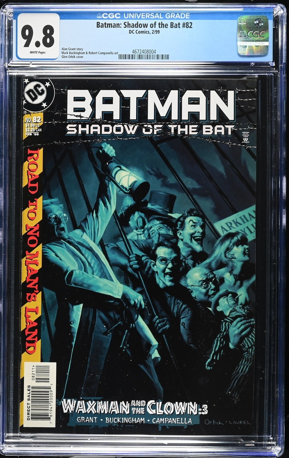 Batman: Shadow of the Bat #82 from 2/99 offers a glimpse into the era's iconic storytelling. This issue is a must-have for collectors. Add this CGC 9.8 graded comic to your collection today!Attribute DetailsCertNumber 4672408004DisplayGrade 9.8GradeCategory ModernPageQuality WHITEArtComments Alan Grant story, Mark Buckingham & Robert Campanella art, Glen Orbik coverCollectibleID 187424CollectibleType CTitle Batman: Shadow of the BatIssue 82IssueDate 2/99Publisher DC ComicsYear 1999PopulationAtGrade 1population_9_0 1population_9_4 1population_9_8 1Seller Information
